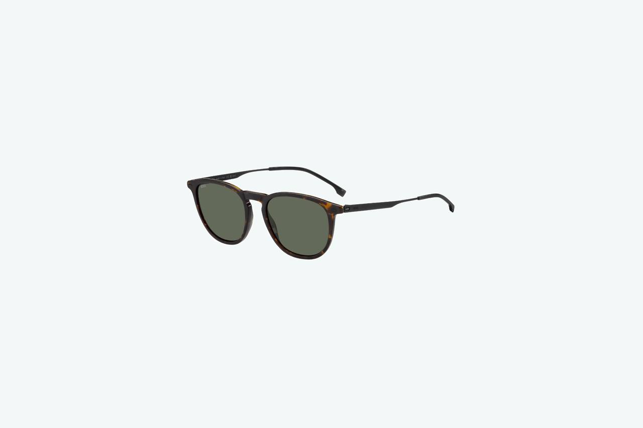 Мужские солнцезащитные очки от BOSS выполнены из металла в цвете "Havana". Линзы выполнены в цвете "Green".