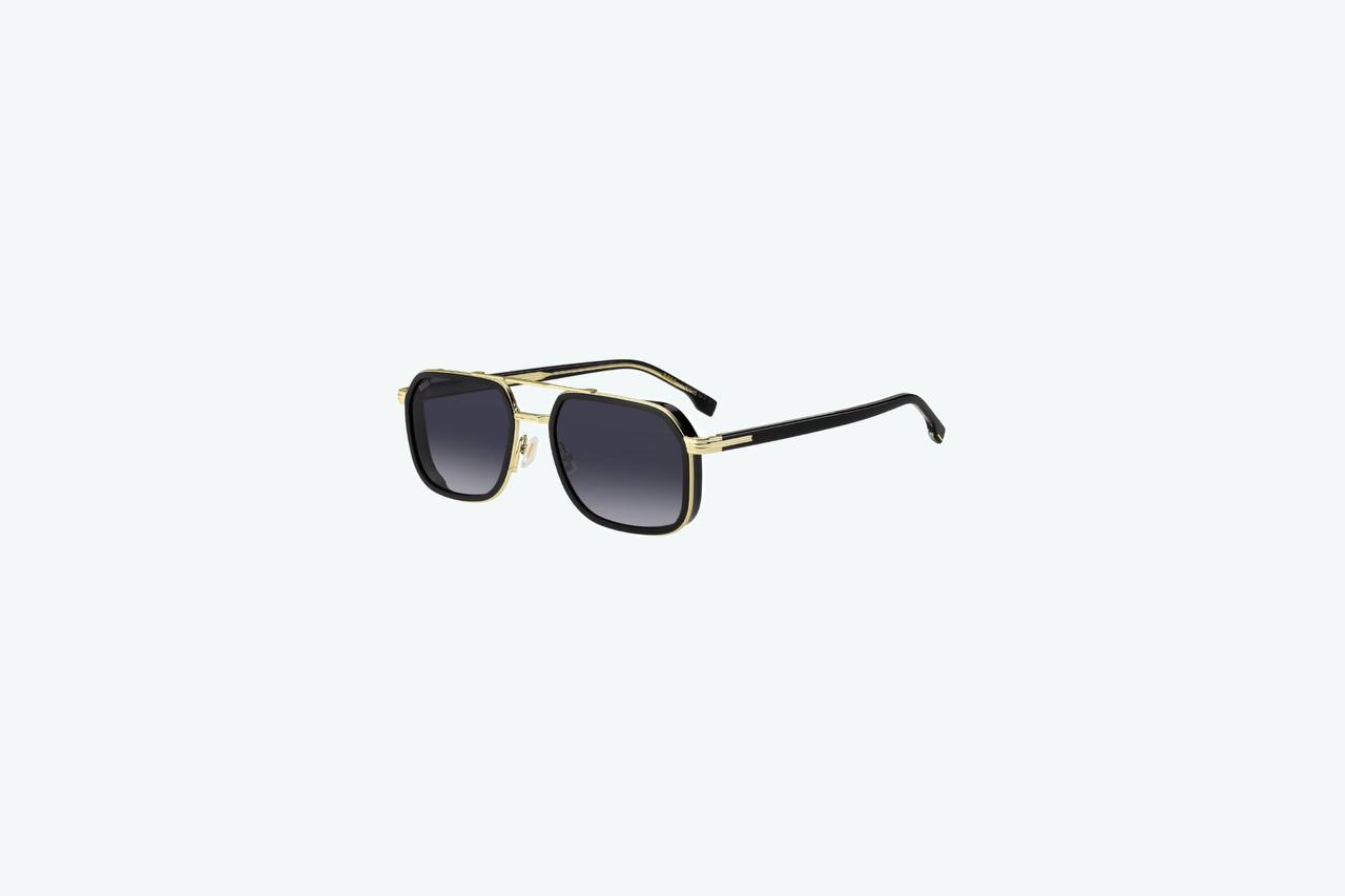 Мужские солнцезащитные очки от BOSS выполнены из металла в чёрном цвете. Линзы выполнены в сером цвете.