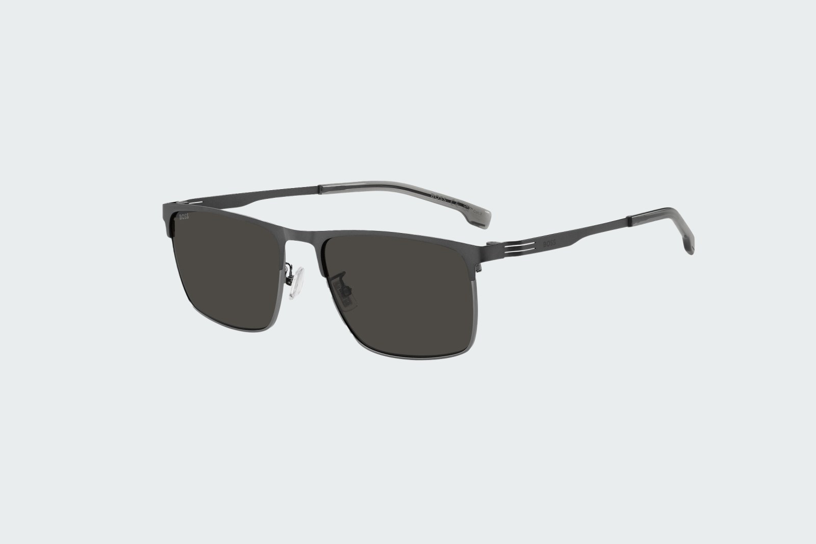 Стильные солнцезащитные очки BOSS с комбинированной оправой (металл и пластик) в благородном серо‑графитовом оттенке. Форма — слегка зауженный прямоугольник с мягкими контурами, подчёркивающий черты лица. Линзы тёмно‑серые с антибликовым покрытием и UV‑фильтром. Модель ориентирована на мужчин, ценящих сдержанную элегантность. Идеально сочетается с деловым и кэжуал‑стилем.