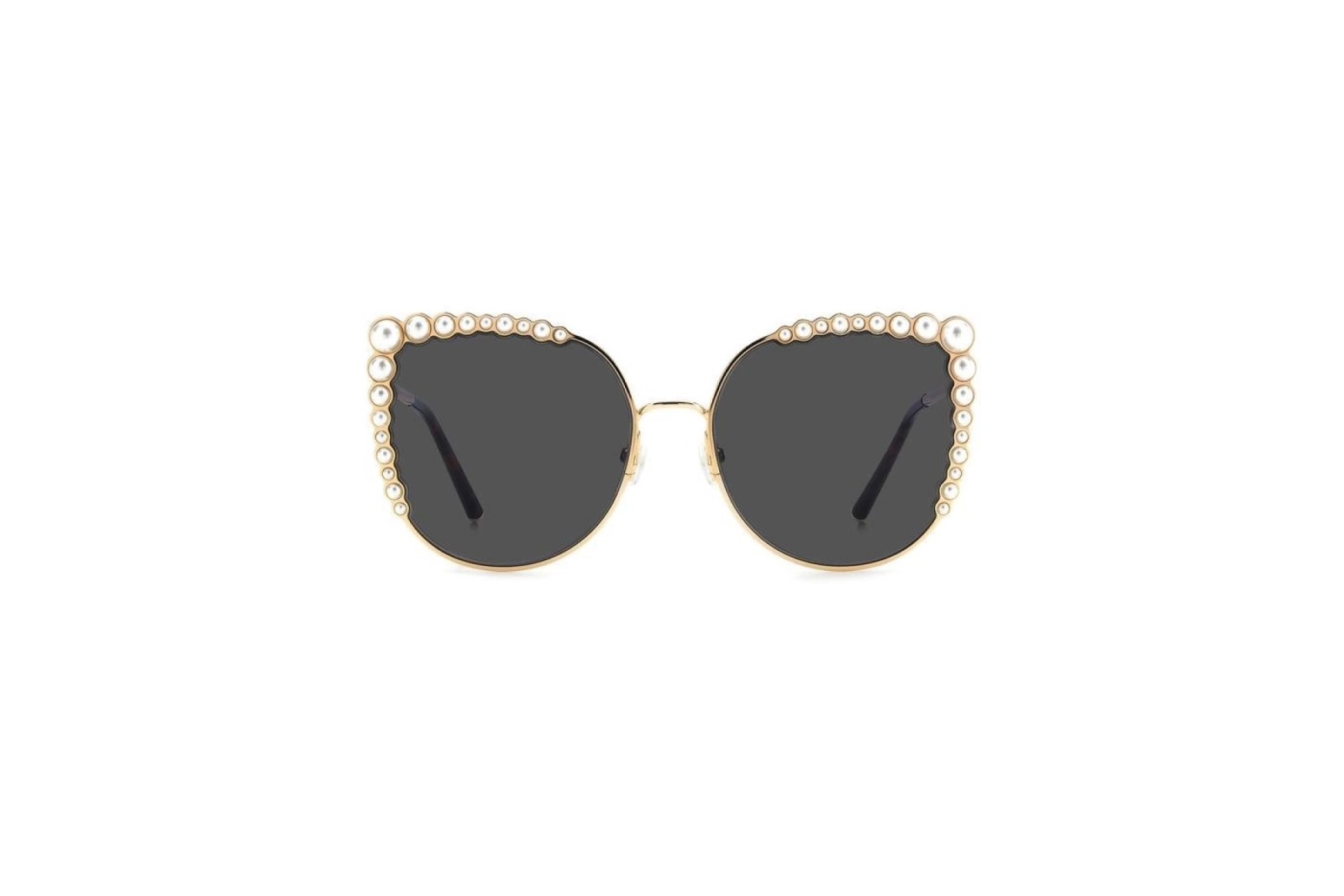 Оправа в стиле cat eye с отделкой из искуственного жемчуга. Очки выполнены из золотистого металла и дополнены затемненными линзами серого цвета. 100% защита от ультрафиолетовых лучей.