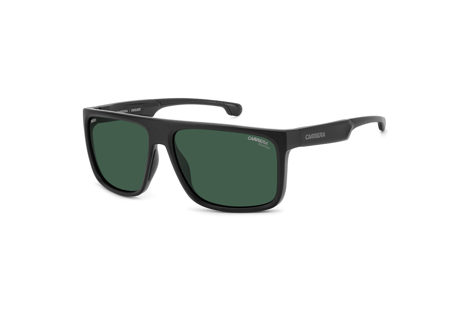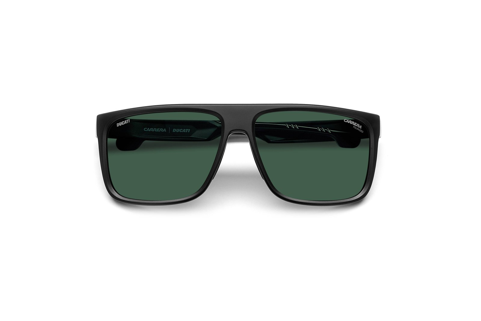 Классическая модель с квадратной оправой из чёрного матового ацетата дополнена зелёными поляризированными линзами в тон.