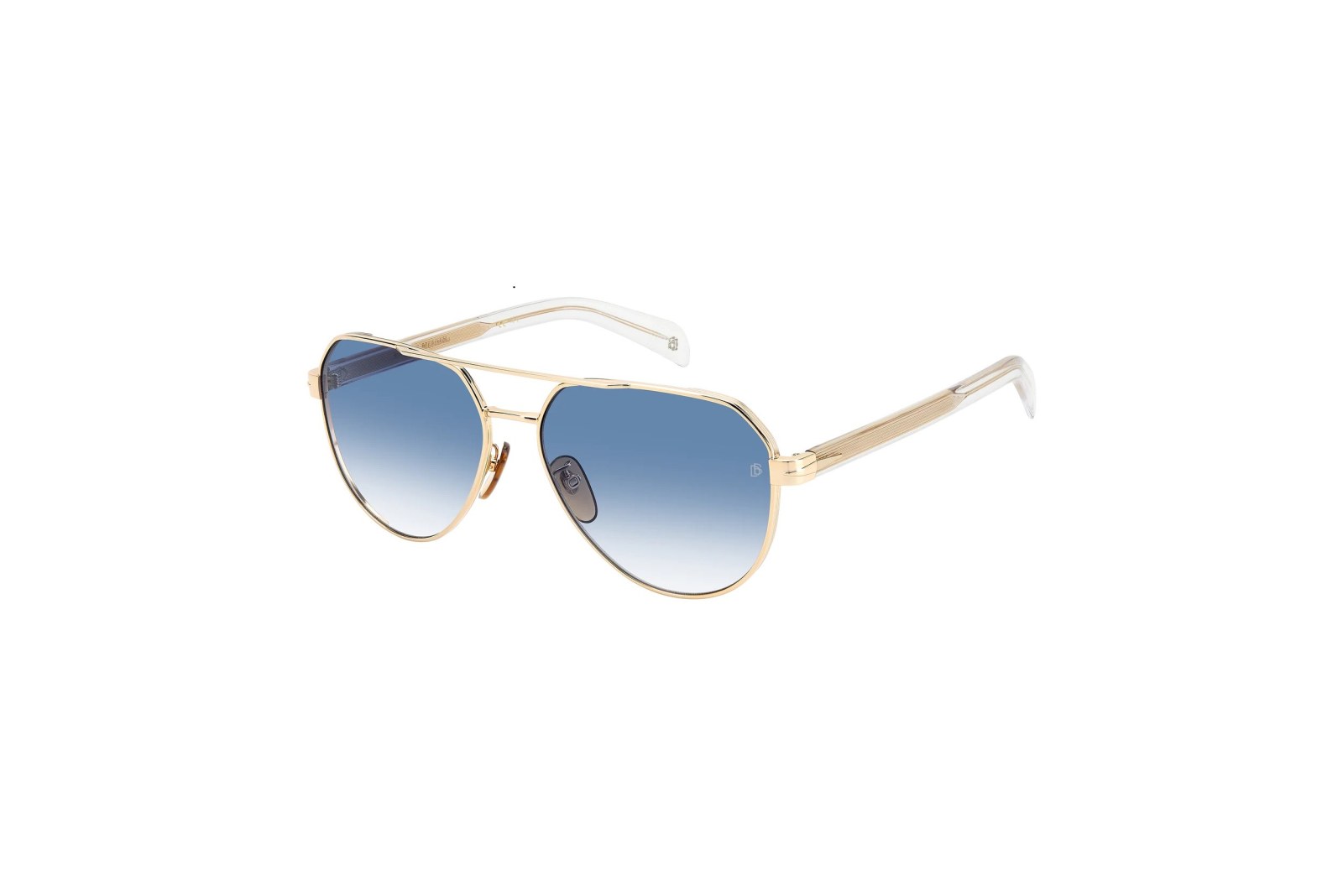 Классическая оправа «авиатор» из легкого металла золотого цвета. Эффектные прозрачные заушники с точеной металлической проволокой украшены внутри подписью Дэвида Бекхэма. Градиентные синие линзы на 100% защищают глаза от вредного ультрафиолета. В комплекте — фирменный чехол и салфетка.