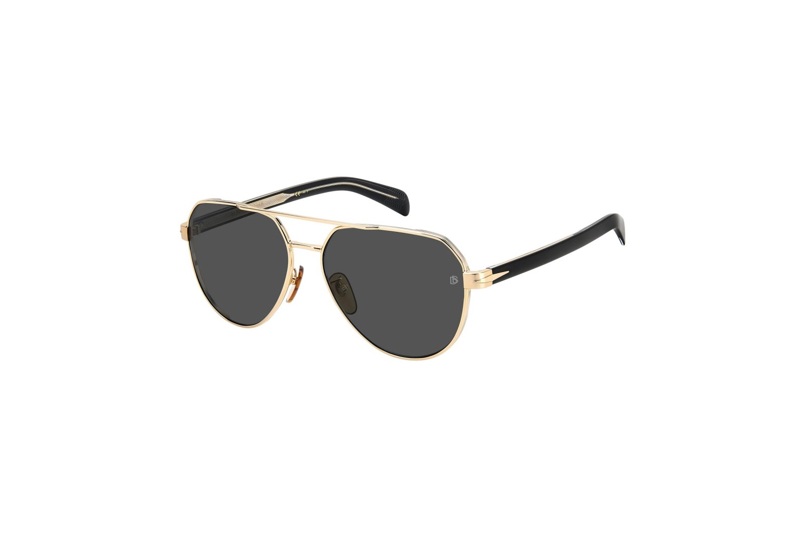 Классическая оправа «авиатор» из легкого металла золотого цвета. Эффектные черные заушники с точеной металлической проволокой украшены внутри подписью Дэвида Бекхэма. Темно-серые линзы на 100% защищают глаза от вредного ультрафиолета. В комплекте — фирменный чехол и салфетка.