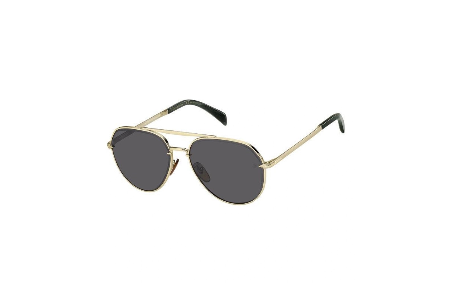 Классическая оправа «авиатор» из легкого металла золотого цвета. Эффектные черные заушники с точеной металлической проволокой украшены внутри подписью Дэвида Бекхэма. Темно-серые линзы на 100% защищают глаза от вредного ультрафиолета. В комплекте — фирменный чехол и салфетка.