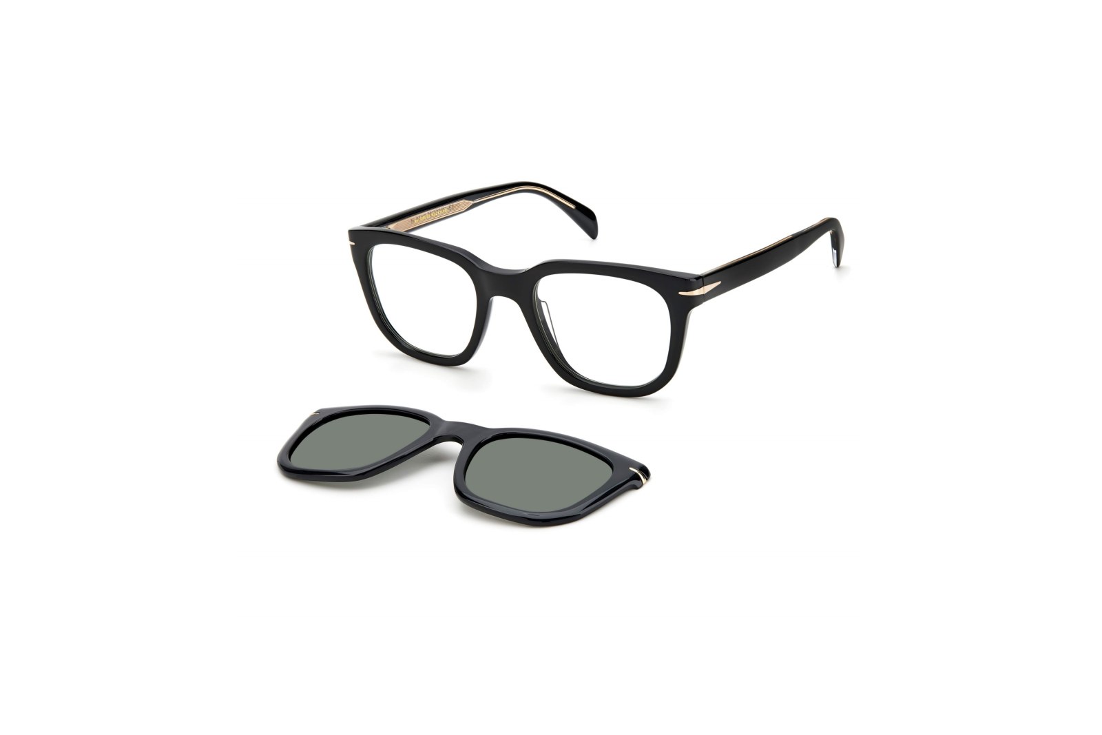 Классическая квадратная оправа выполнена из ацетата черного цвета и дополнены системой clip-on, позволяющей сменять формат солнцезащитных линз на медицинские. Зеленые солнцезащитные линзы на 100% защищают глаза от вредного ультрафиолета. В комплекте — фирменный чехол и салфетка.
