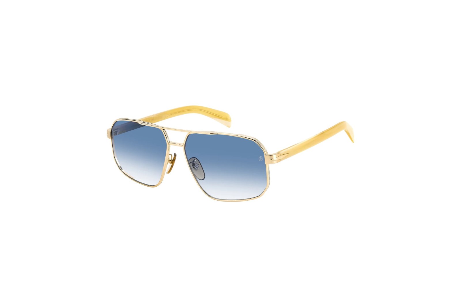 Геометрическая восьмиугольная оправа из легкого металла золотого цвета дополнена черными заушниками. Темно-синие градиентные линзы с монограммой DB на 100% защищают глаза от вредного ультрафиолета. В комплекте — фирменный футляр для очков и салфетка.
