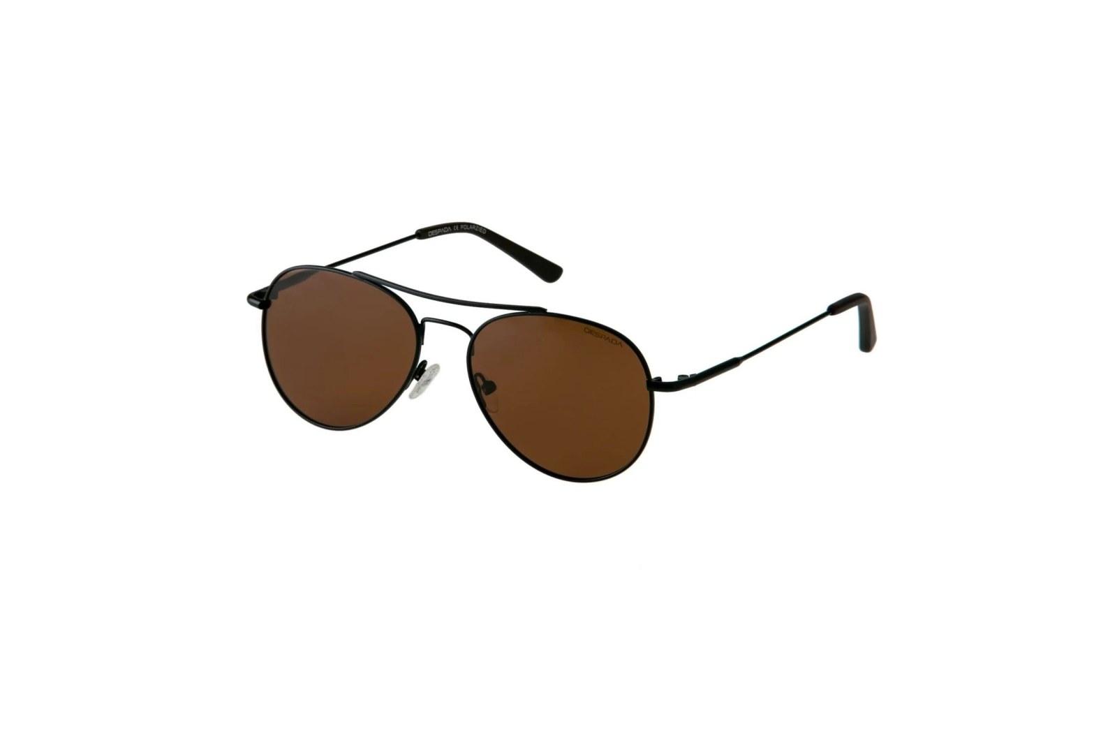 Классическая оправа «авиатор» из легкого металла черного цвета. Коричневые линзы на 100% защищают глаза от вредного ультрафиолета. В комплекте — фирменный чехол и салфетка.