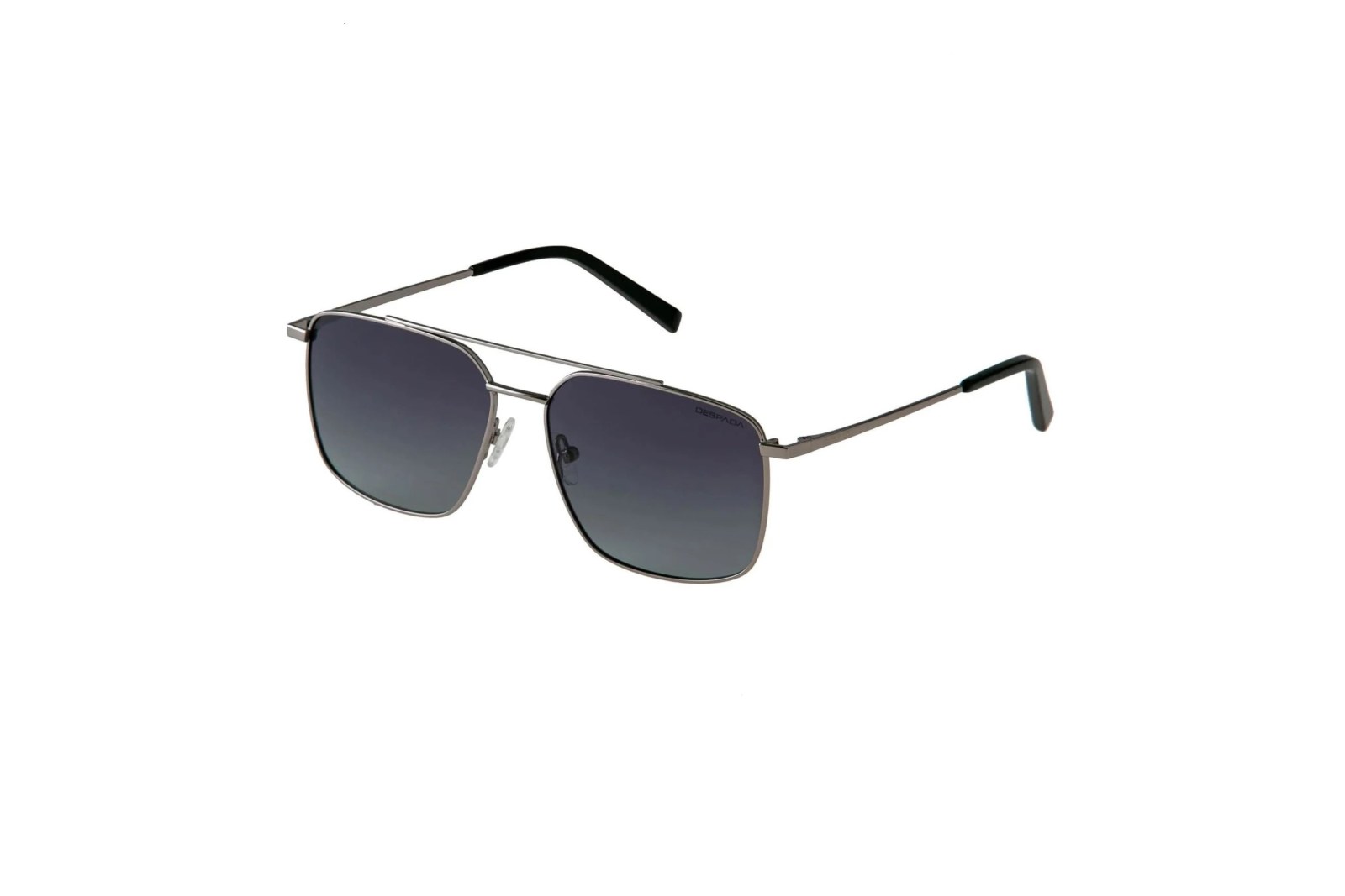 Стильная прямоугольная оправа выполнена из легкого серого металла. Градиентные серые линзы на 100% защищают глаза от вредного ультрафиолета. В комплекте — фирменный футляр для очков и салфетка.