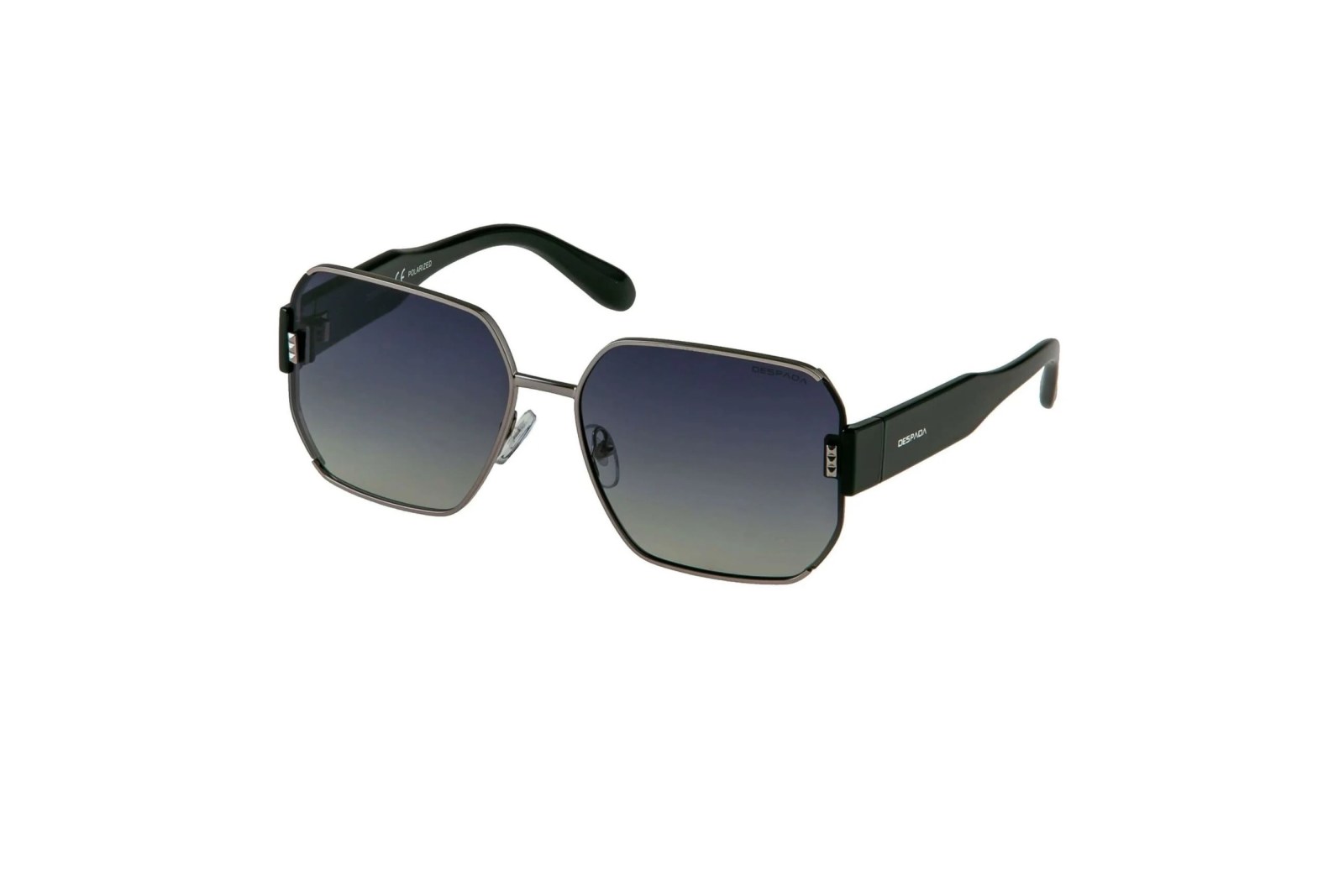 Женственная геометрическая оправа выполнена из легкого металла серого цвета и дополнена массивными черными дужками. Градиентные серые линзы на 100% защищают глаза от вредного ультрафиолета. В комплекте — фирменный чехол и салфетка.