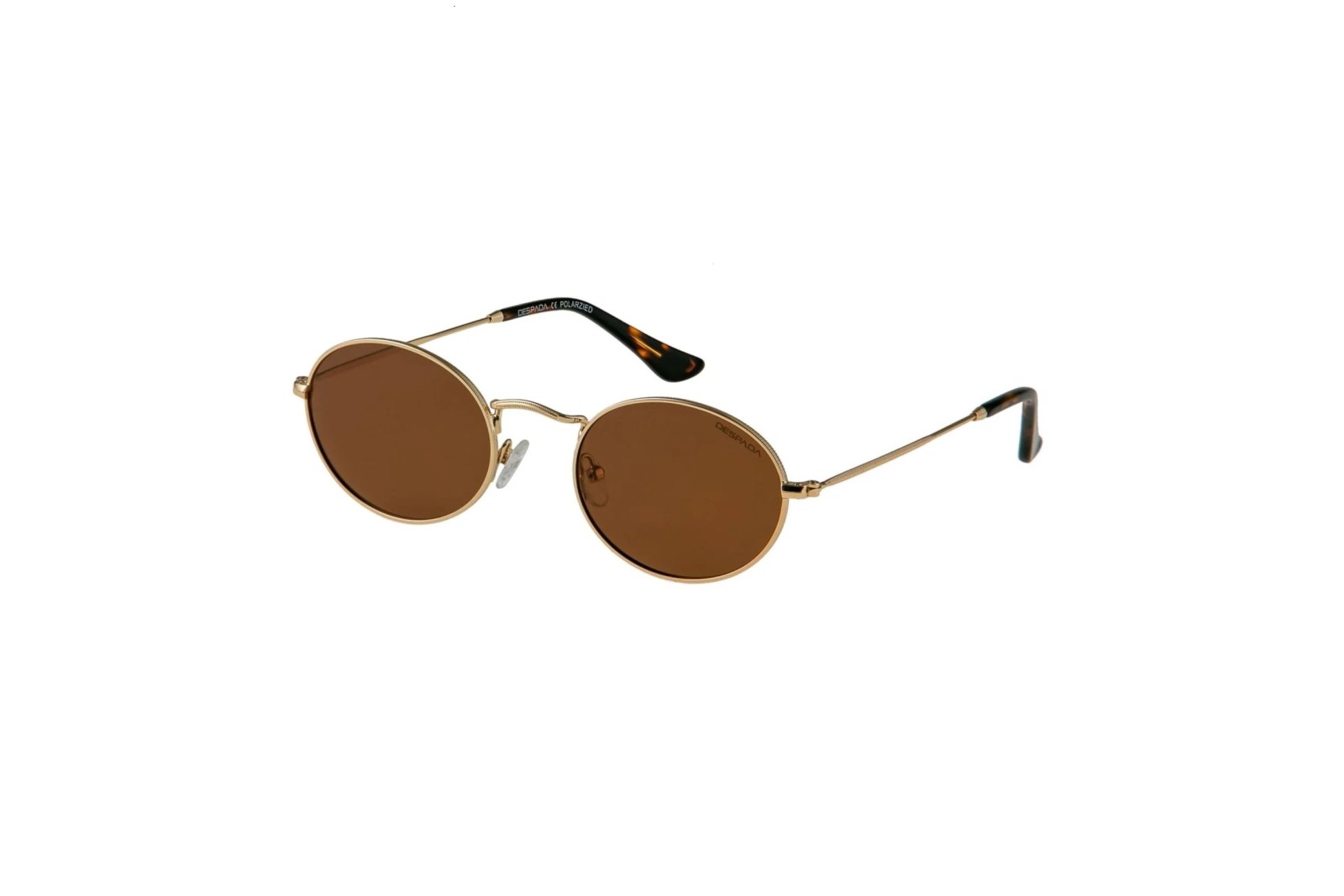 Изящная модель с овальной оправой выполнена из легкого золотого металла и дополнена заушниками в черепаховой расцветке. Коричневые линзы на 100% защищают глаза от вредного ультрафиолета. В комплекте — фирменный чехол и салфетка.