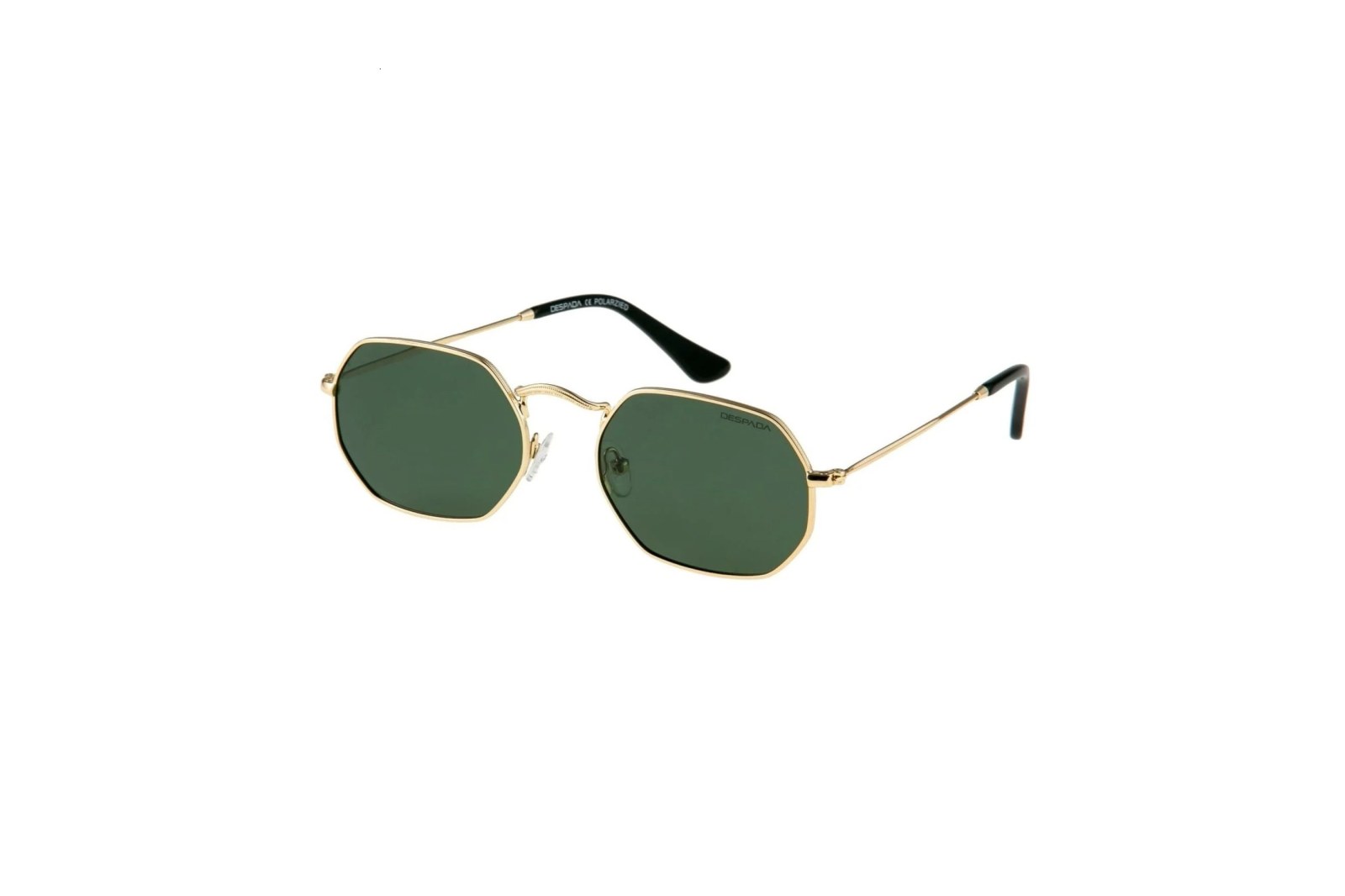 Женственная геометрическая оправа выполнена из легкого металла золотого цвета и дополнена заушниками черного цвета. Зеленые линзы на 100% защищают глаза от вредного ультрафиолета. В комплекте — фирменный чехол и салфетка.