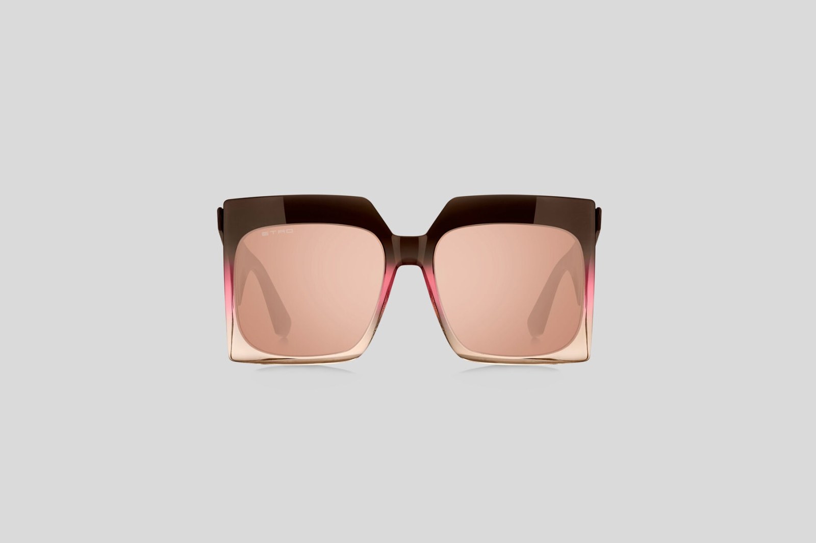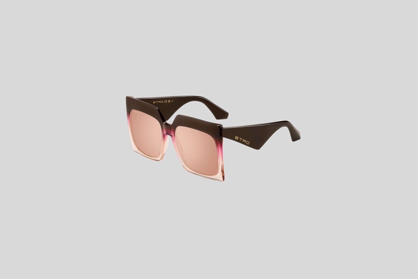 Массивная модель с квадратной оправой выполнена из градиентного ацетата в коричнево-розовых тонах. Широкие геометричные дужки украшены тисненым логотипом золотистого оттенка. Коричневые линзы на 100% защищают от вредного воздействия ультрафиолетовых лучей. В комплекте — фирменный чехол и салфетка.