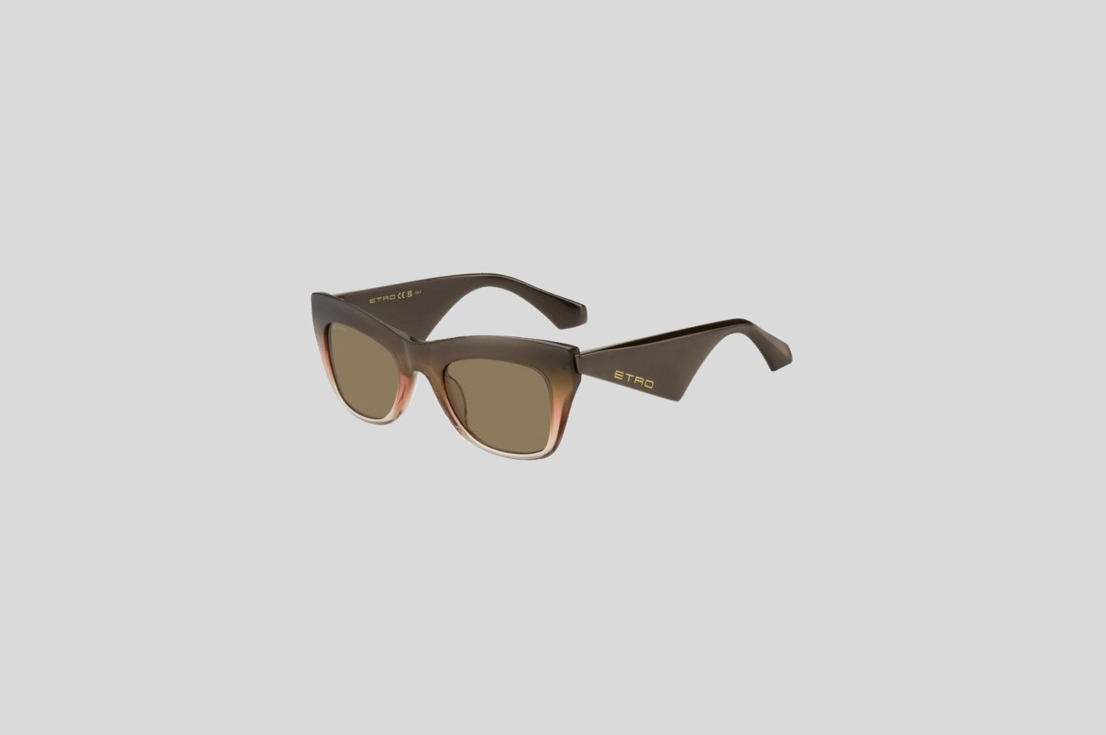 Массивная модель с оправой cat eye выполнена из градиентного ацетата в коричнево-бежевых тонах. Широкие геометричные дужки украшены тисненым логотипом золотистого оттенка. Коричневые линзы на 100% защищают от вредного воздействия ультрафиолетовых лучей. В комплекте — фирменный чехол и салфетка.