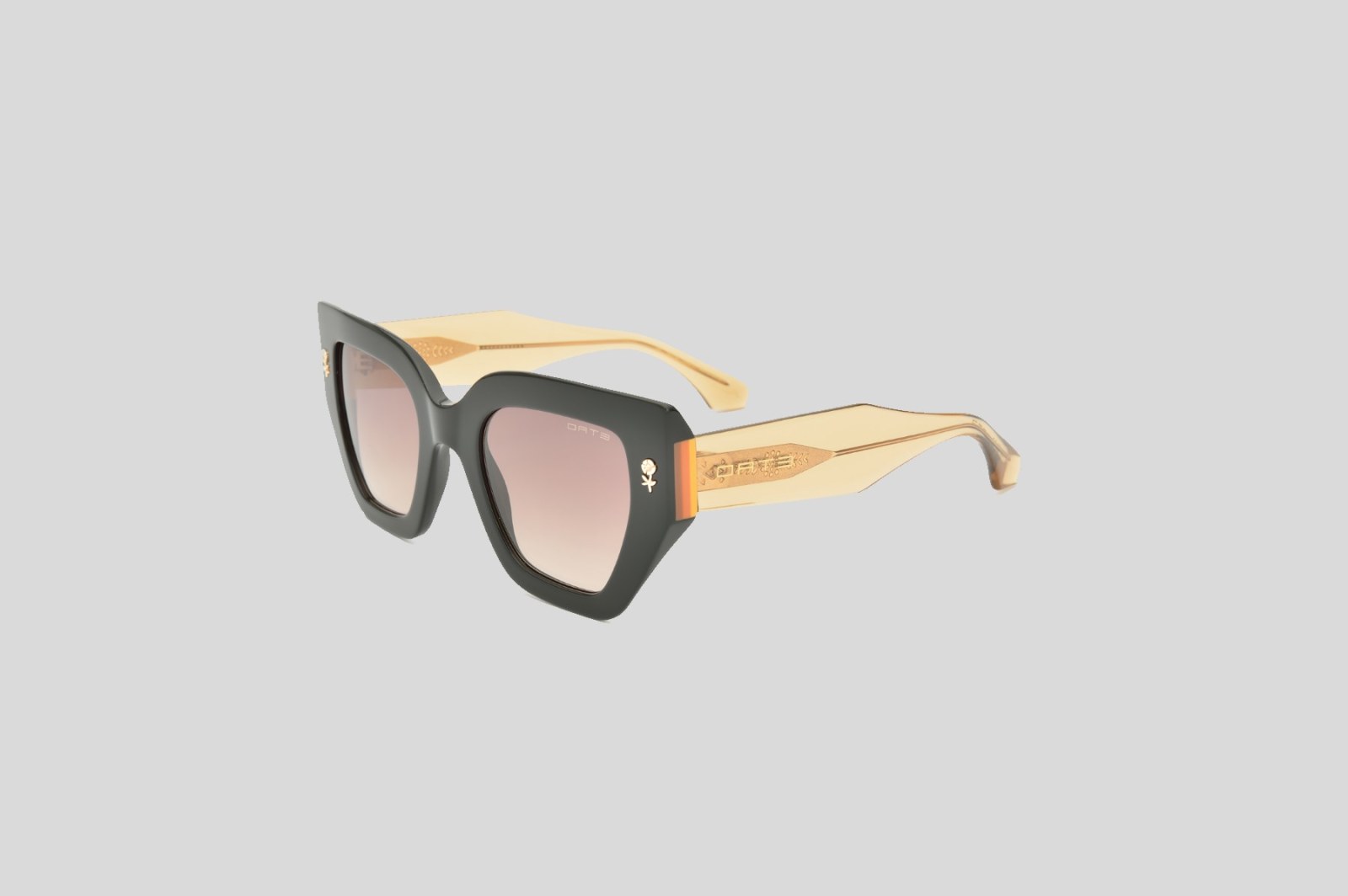 Стильная модель с оправой cat eye выполнена из черного ацетата. Широкие геометричные дужки желтого цвета украшены тисненым логотипом золотистого оттенка. Желтые линзы на 100% защищают от вредного воздействия ультрафиолетовых лучей. В комплекте — фирменный чехол и салфетка.