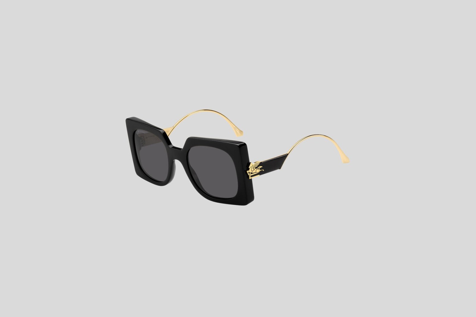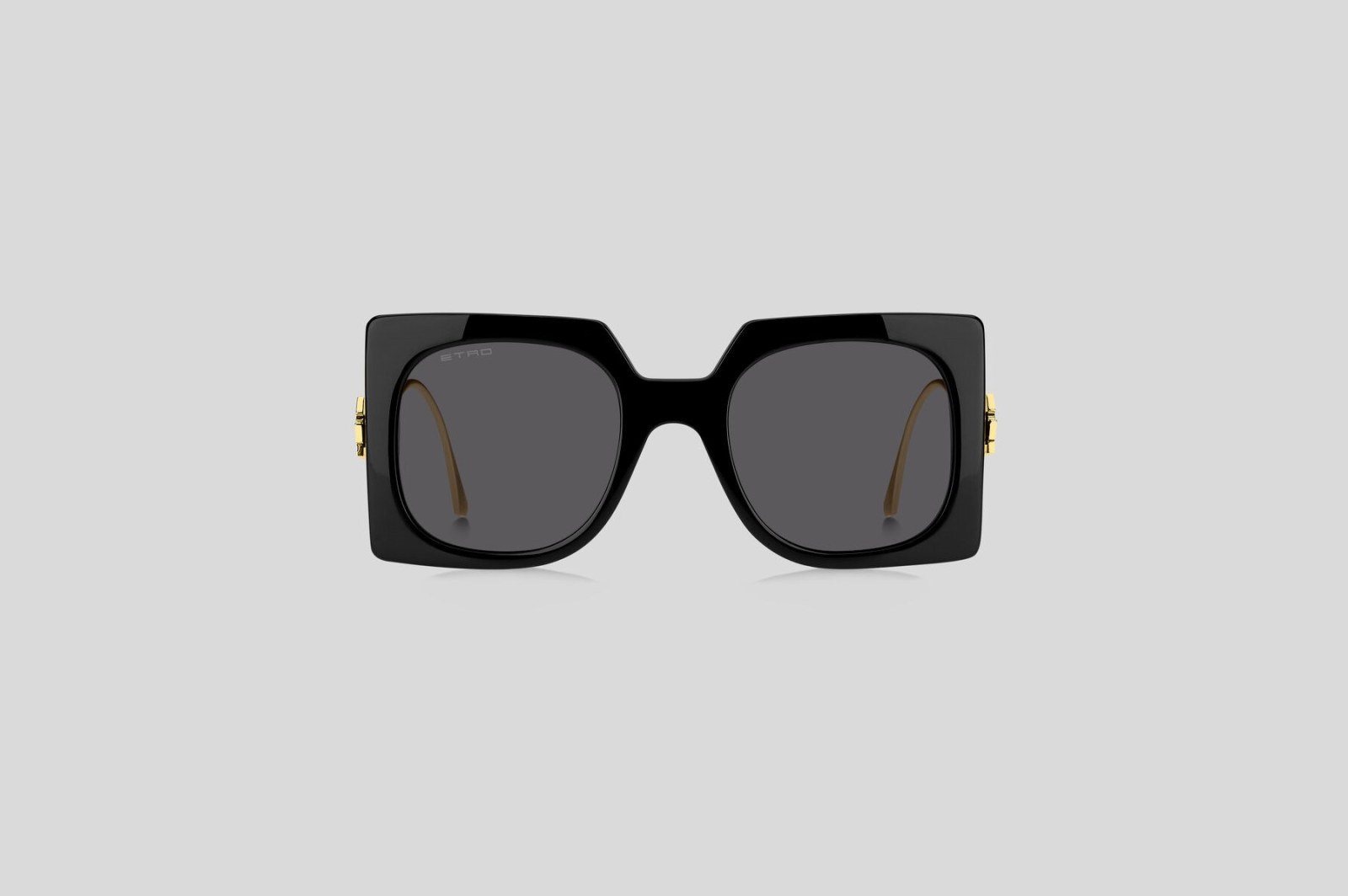 Массивная модель с квадратной оправой выполнена из черного ацетата. Тонкие дужки из золотистого металла украшены тисненым логотипом золотистого оттенка. Серые линзы на 100% защищают от вредного воздействия ультрафиолетовых лучей. В комплекте — фирменный чехол и салфетка.