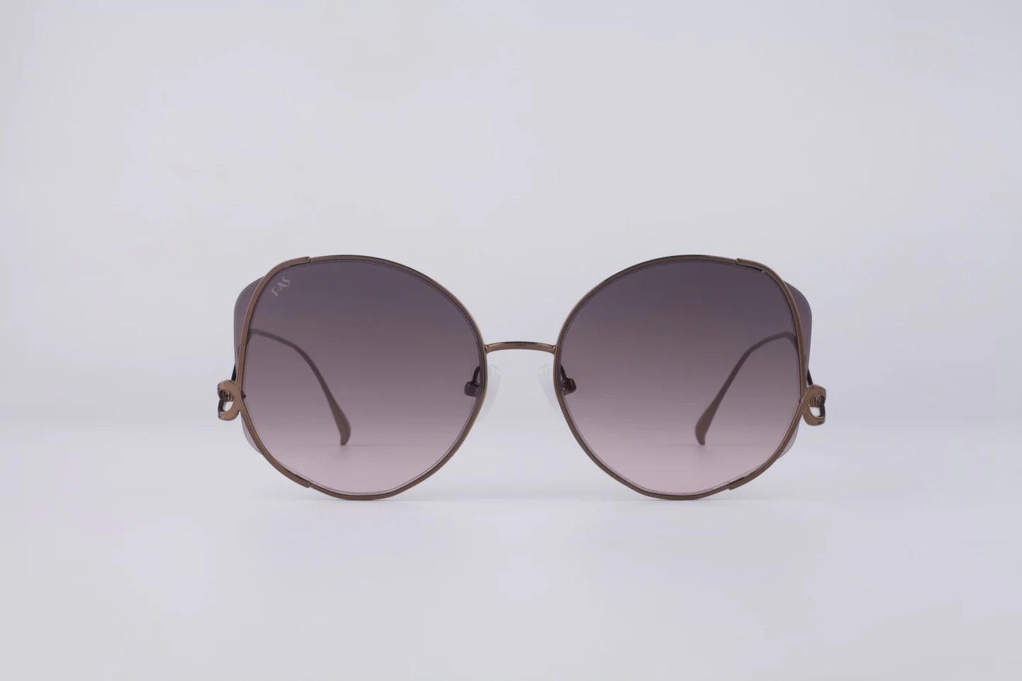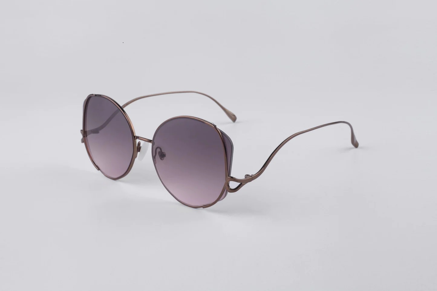Оригинальная геометрическая оправа из легкого коричневого металла. Градиентные темно-сиреневые линзы на 100% защищают глаза от вредного ультрафиолета. На всех позолоченных рамах 12-каратное золотое покрытие. В комплекте — фирменный футляр для очков и салфетка.