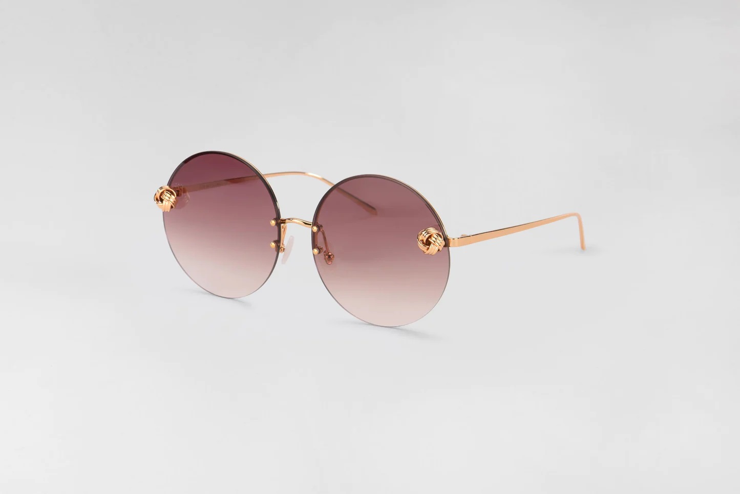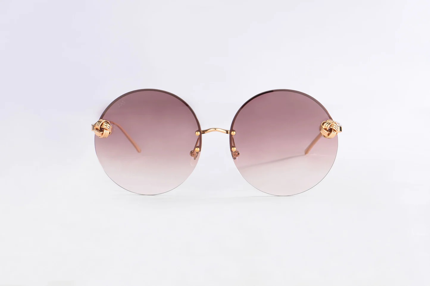 Безободковая круглая оправа, украшенная завязанными деталями на обеих линзах. Дужки и заушники выполнены из легкого металла, покрытого 18-каратным золотом. Градиентные розовые линзы со 100% защитой глаза от вредного ультрафиолета. В комплекте — фирменный футляр для очков и салфетка.