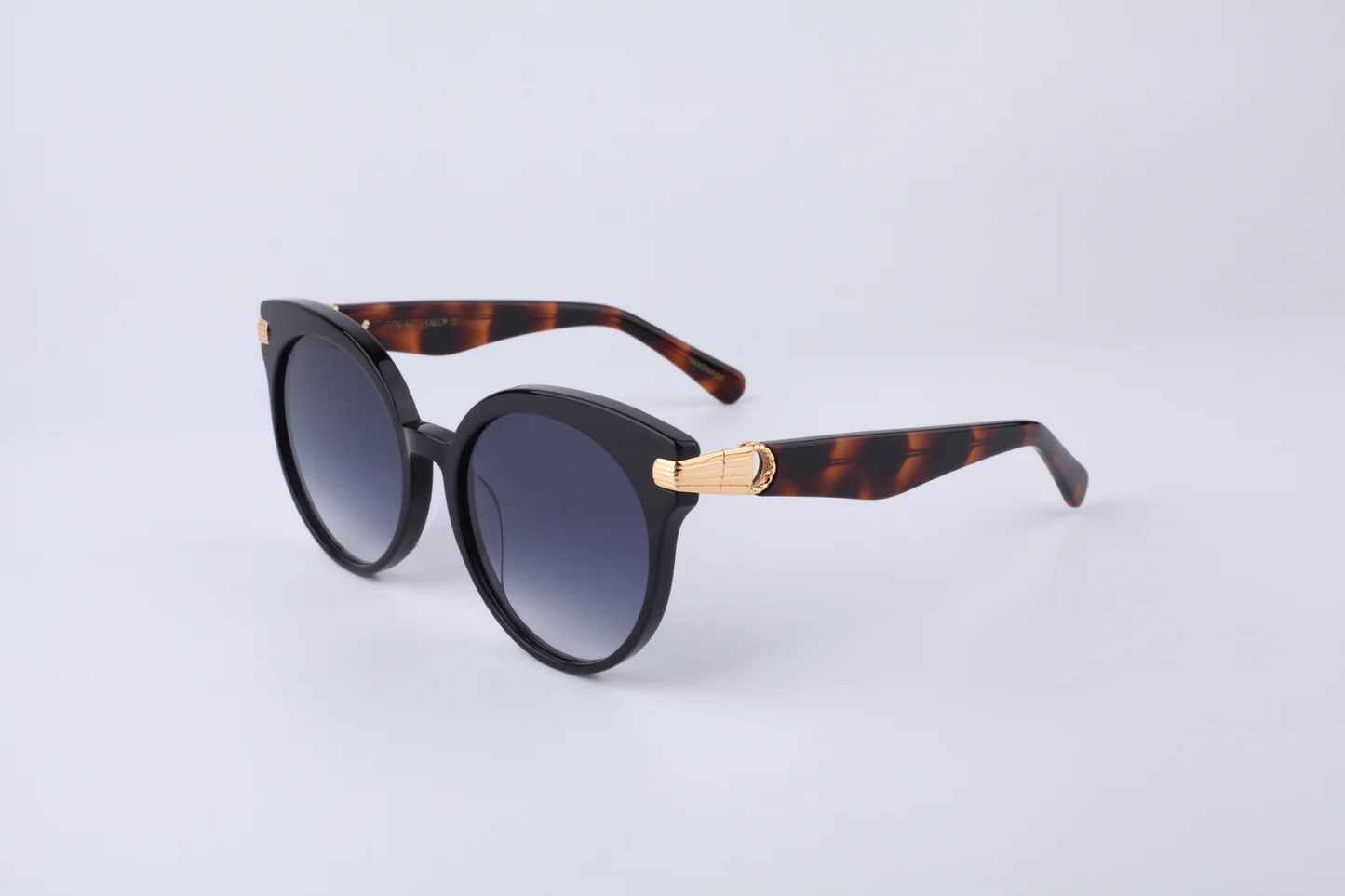 Женственная круглая оправа, изготовленная вручную из черного ацетата, украшена дужками с 18-каратным золотым покрытием. Градиентные серые линзы на 100% защищают глаза от вредного ультрафиолета. В комплекте — фирменный чехол и салфетка.