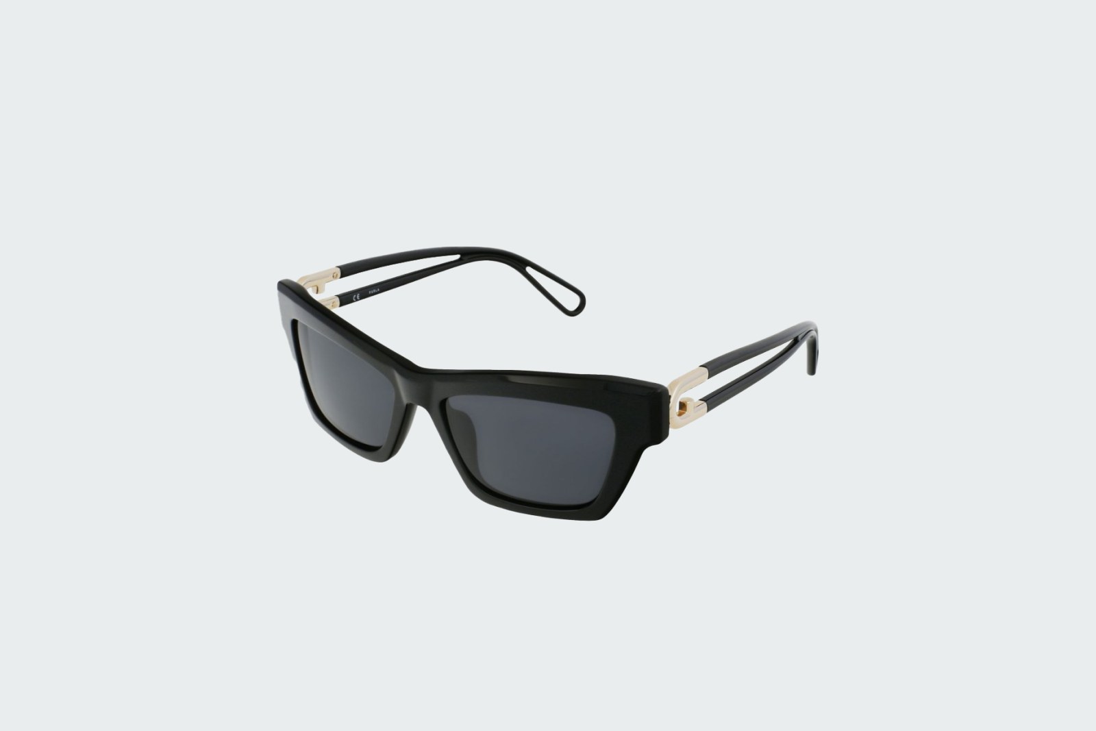 Прямоугольная оправа классической формы из черного ацетата. Стильные раздвоенные заушники с металлическими золотистыми вставками. Серые линзы со 100% защитой глаза от вредного ультрафиолета. В комплекте — фирменный футляр для очков и салфетка.