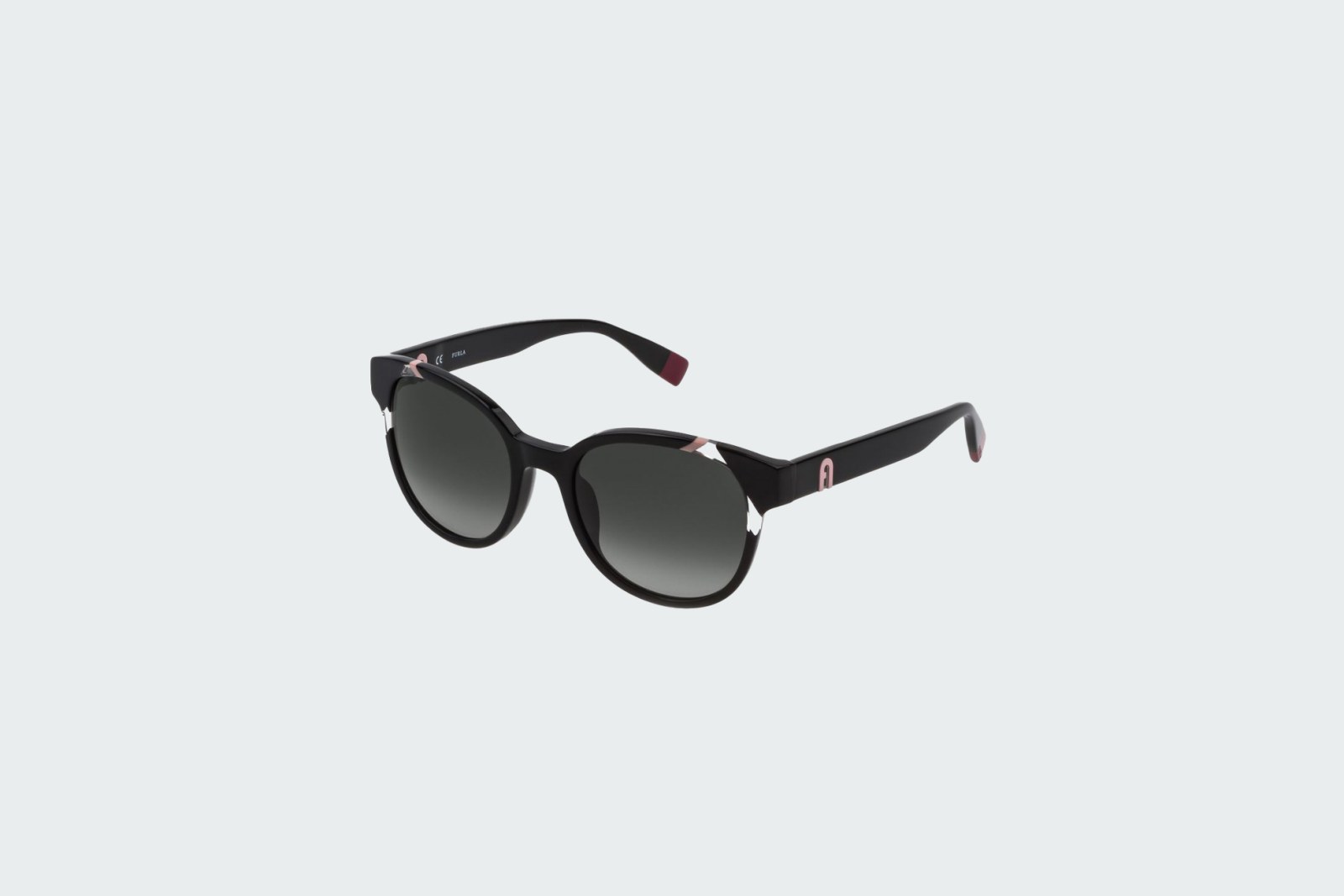 Оправа выполнена из черного ацетата со стильными металлическими вставками. Однотонные серые линзы со 100% защитой глаза от вредного ультрафиолета. В комплекте — фирменный футляр для очков и салфетка.