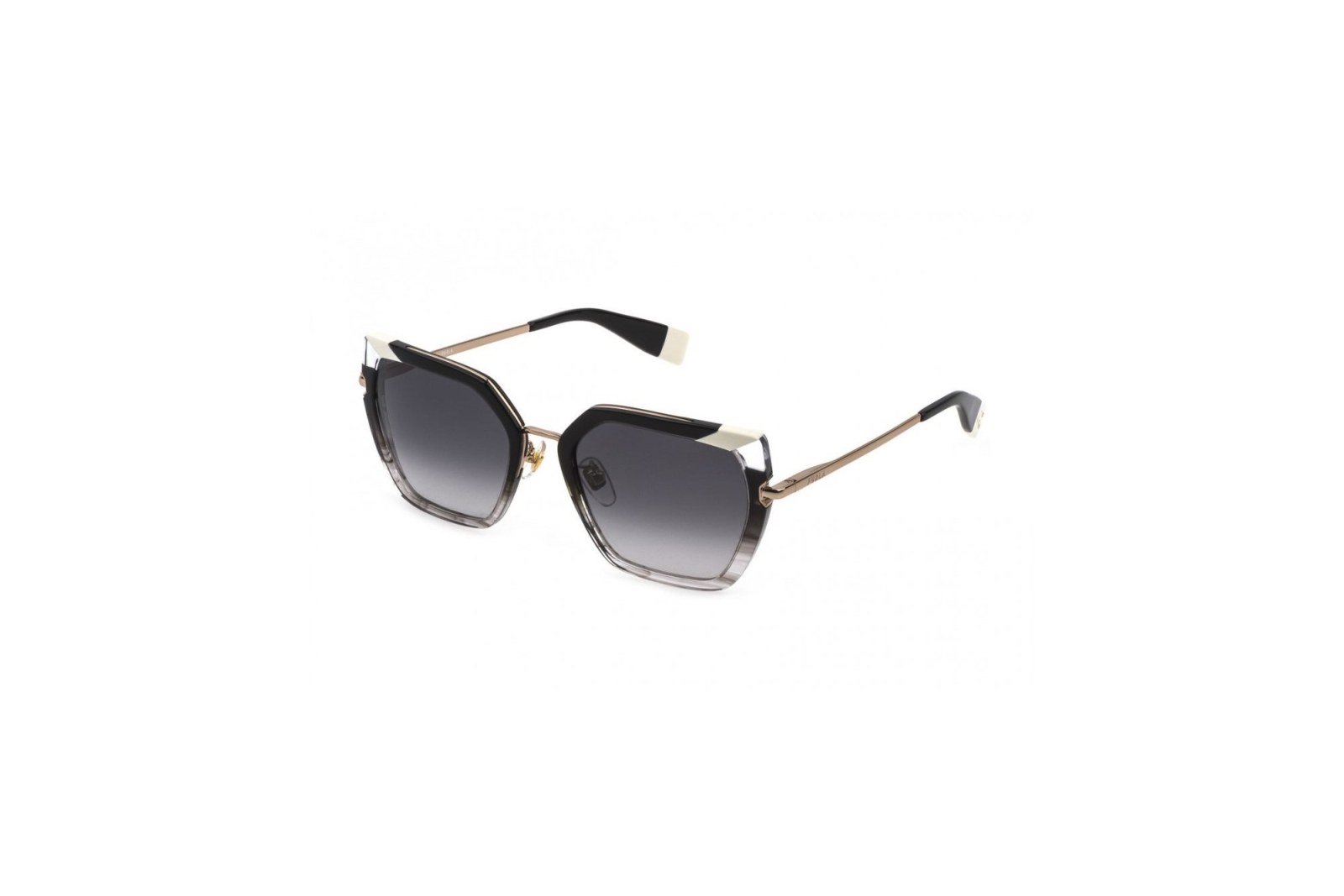 Геометрическая оправа выполнена из легкого металла серого цвета. Градиентные серые линзы со 100% защитой глаза от вредного ультрафиолета. В комплекте — фирменный футляр для очков и салфетка.
