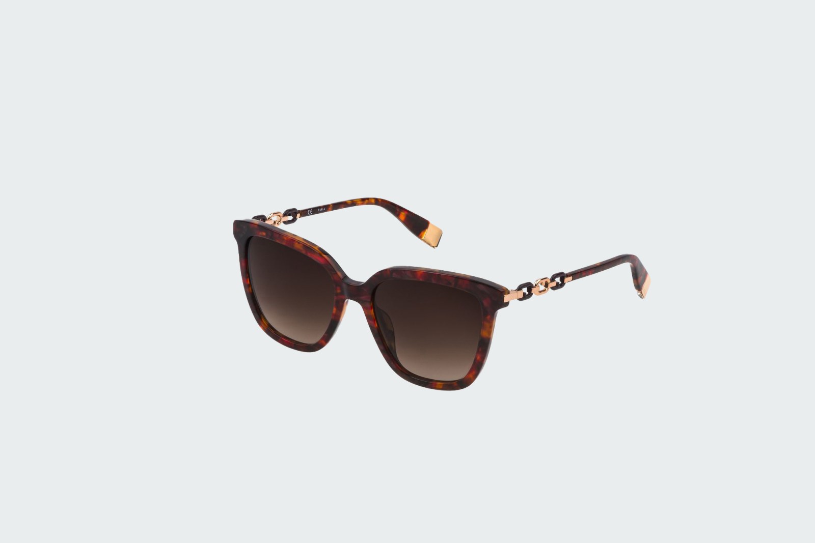 Модная черепаховая оправа с металлическим узором на заушниках. Линзы квадратной формы с коричневым градиентом обеспечивают 100% защиту глаз от вредного ультрафиолета. В комплекте — фирменный футляр для очков и салфетка.