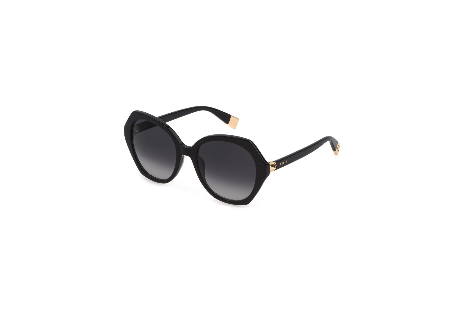 Геометрическая оправа выполнена из черного ацетата. Градиентные серые линзы со 100% защитой глаза от вредного ультрафиолета. В комплекте — фирменный футляр для очков и салфетка.