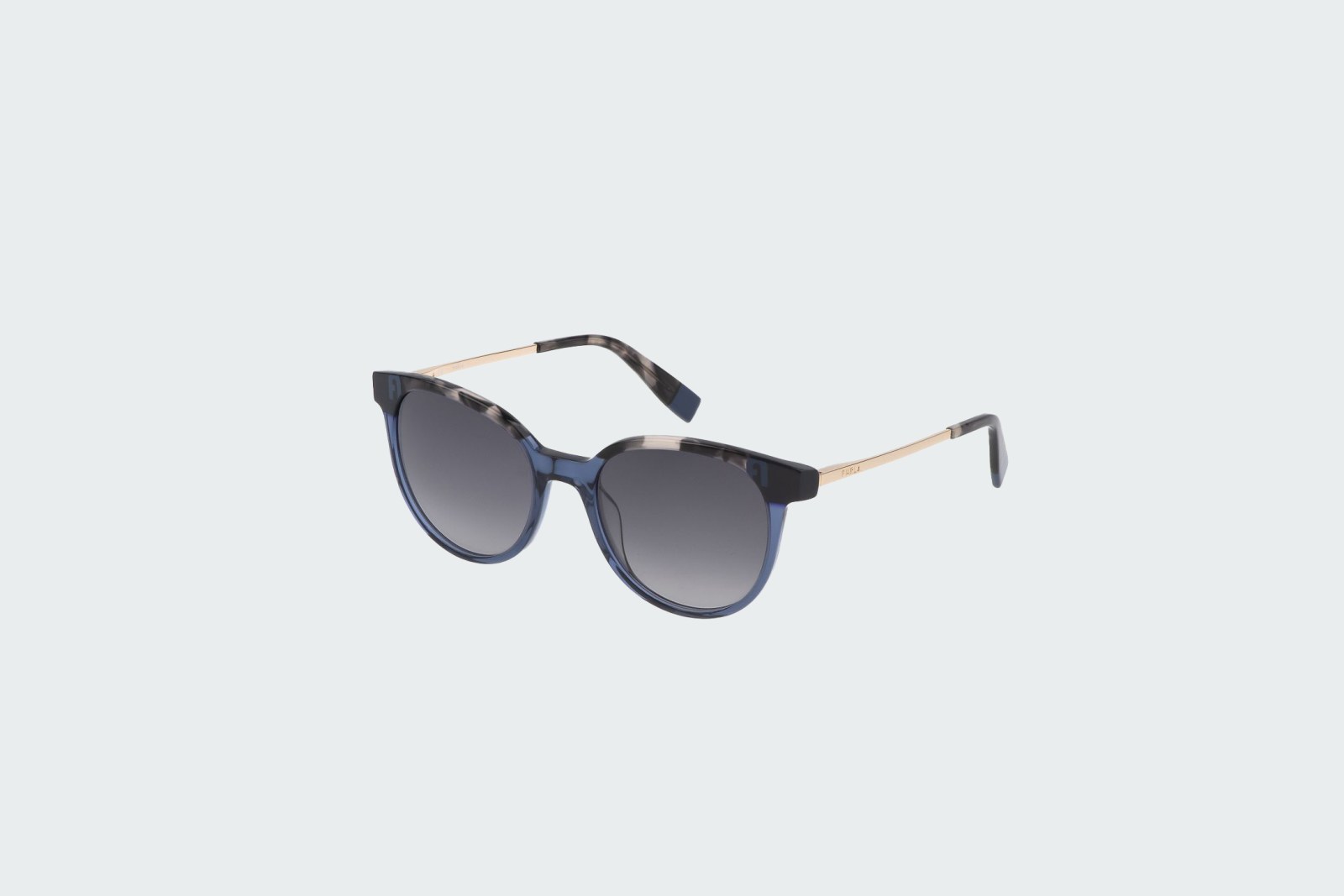Модная оправа голубого цвета с узором. Градиентные серые линзы со 100% защитой глаза от вредного ультрафиолета. В комплекте — фирменный футляр для очков и салфетка.