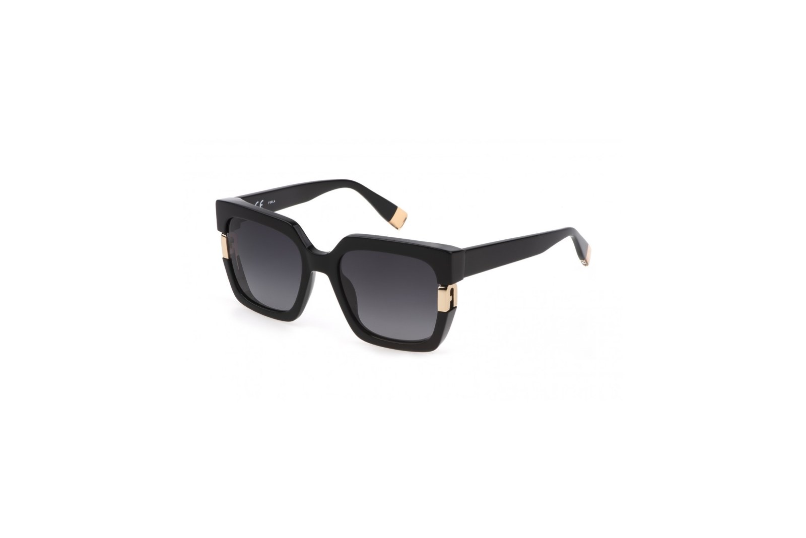 Классическая прямоугольная оправа выполнена из черного ацетата и украшена логотипом бренда. Градиентные серые линзы со 100% защитой глаза от вредного ультрафиолета. В комплекте — фирменный футляр для очков и салфетка.
