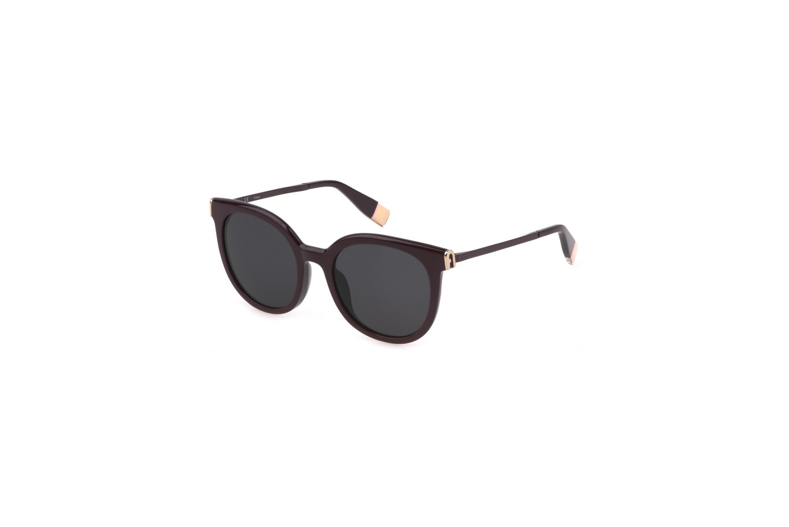 Женственная круглая оправа выполнена из ацетата бордового цвета и украшена логотипом бренда. Серые линзы со 100% защитой глаза от вредного ультрафиолета. В комплекте — фирменный футляр для очков и салфетка.