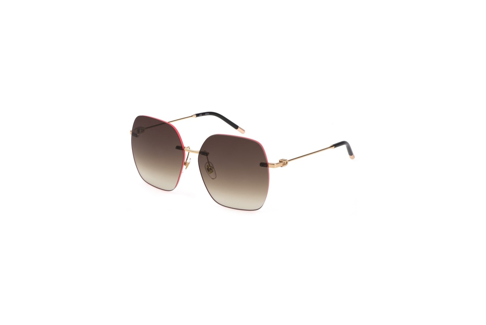 Безободковая геометрическая оправа выполнена из легкого металла красного цвета. Градиентные коричневые линзы со 100% защитой глаза от вредного ультрафиолета. В комплекте — фирменный футляр для очков и салфетка.