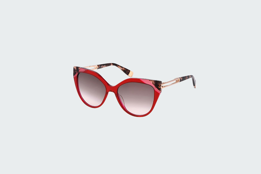 Дерзская оправа «кошачий глаз» выполнена из легкого прочного пластика красного цвета. Украшена узором и металлическими вставками на заушниках. Градиентные линзы со 100% защитой глаза от вредного ультрафиолета. В комплекте — фирменный футляр для очков и салфетка.