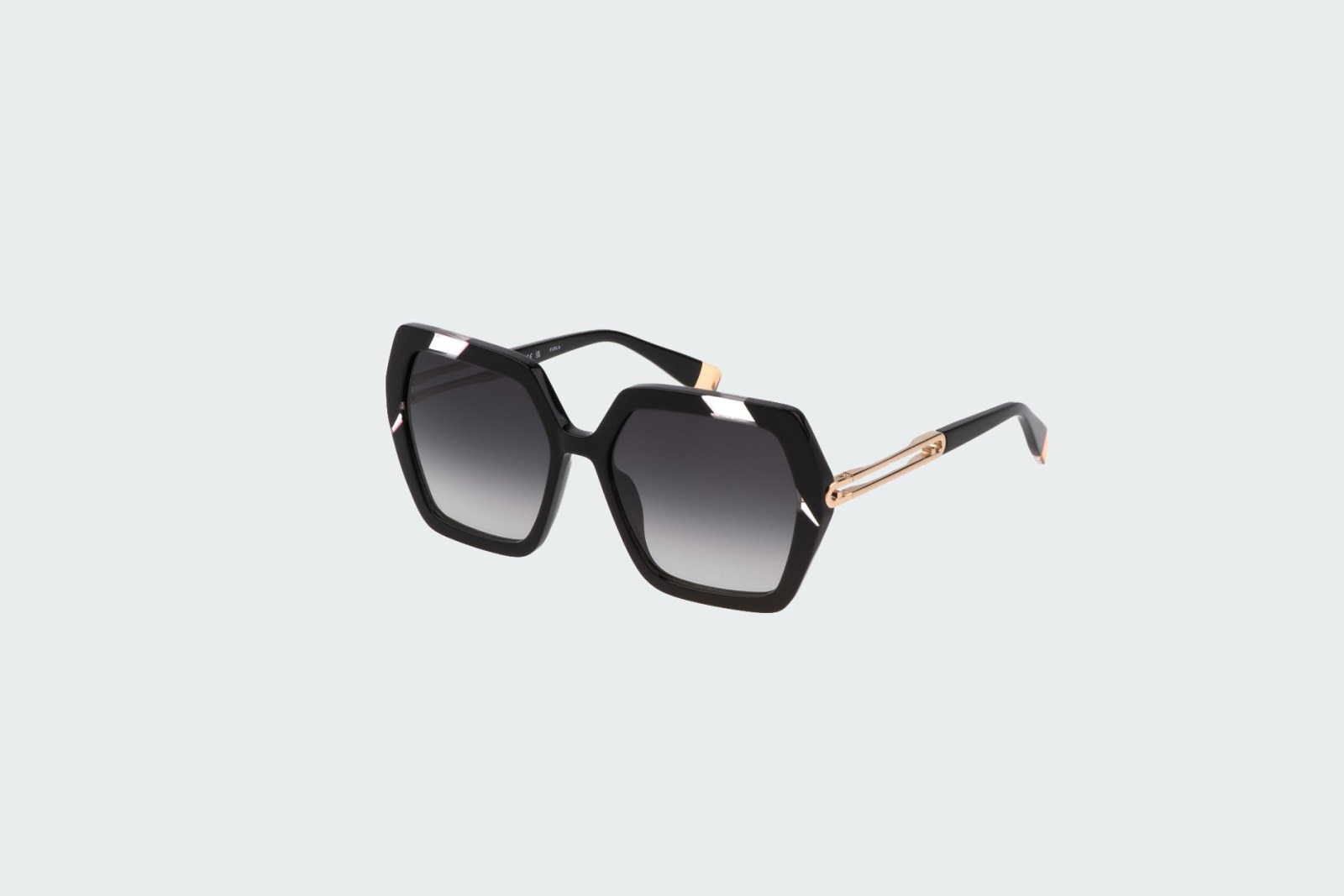 Геометрическая оправа выполнена из черного ацетата. Градиентные серые линзы со 100% защитой глаза от вредного ультрафиолета. В комплекте — фирменный футляр для очков и салфетка.