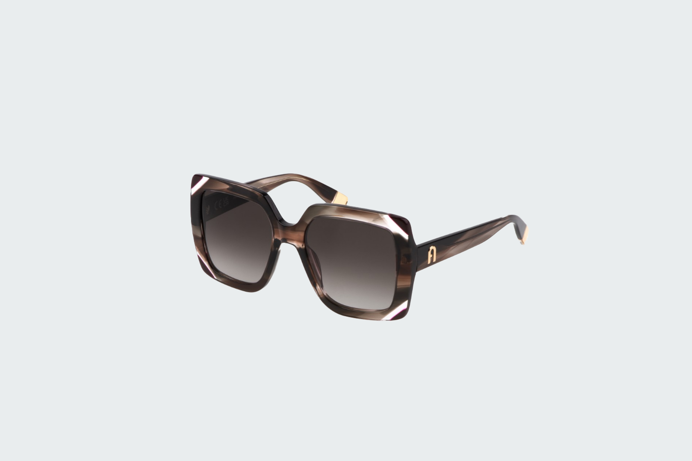 Квадратная оправа выполнена из мраморного коричневого ацетата. Заушники украшены металлическим логотипом. Градиентные линзы со 100% защитой глаза от вредного ультрафиолета. В комплекте — фирменный футляр для очков и салфетка.