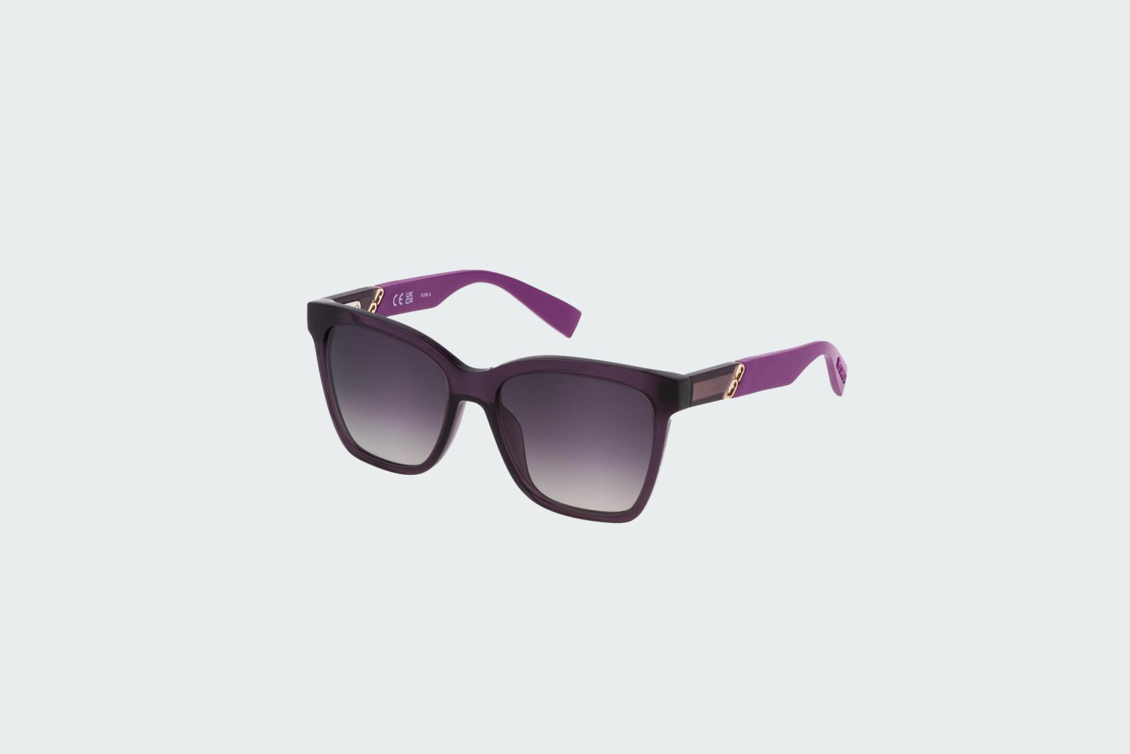 Классическая оправа выполнена из фиолетового ацетата. Яркие заушники украшены двойным металлическим логотипом в форме арки. Градиентные линзы со 100% защитой глаза от вредного ультрафиолета. В комплекте — фирменный футляр для очков и салфетка.