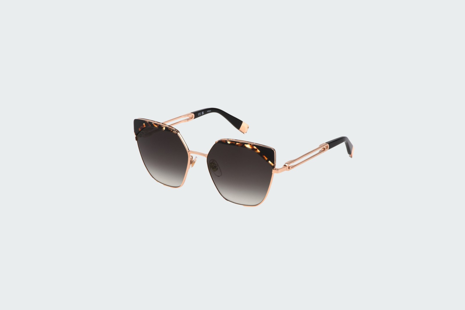 Тонкая металлическая оправа с пластиковыми черепаховыми вставками. Градиентные линзы со 100% защитой глаза от вредного ультрафиолета. В комплекте — фирменный футляр для очков и салфетка.