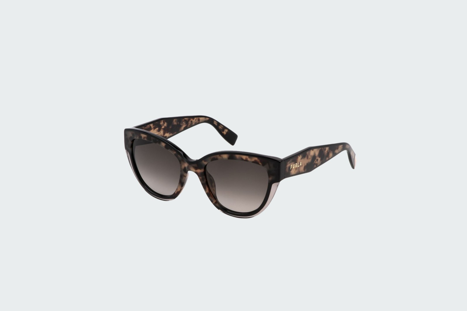 Модная черепаховая оправа в коричневом цвете. Широкие заушники украшены золотистым логотипом бренда. Градиентные линзы со 100% защитой глаза от вредного ультрафиолета. В комплекте — фирменный футляр для очков и салфетка.