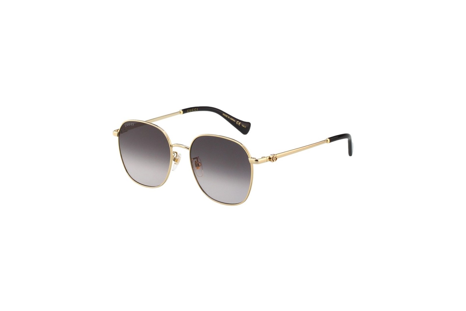 Изящная модель с округлой оправой выполнена из легкого золотого металла и дополнена дужками с логотипом бренда. Градиентные серые линзы на 100% защищают глаза от вредного ультрафиолета. В комплекте — фирменный чехол и салфетка.