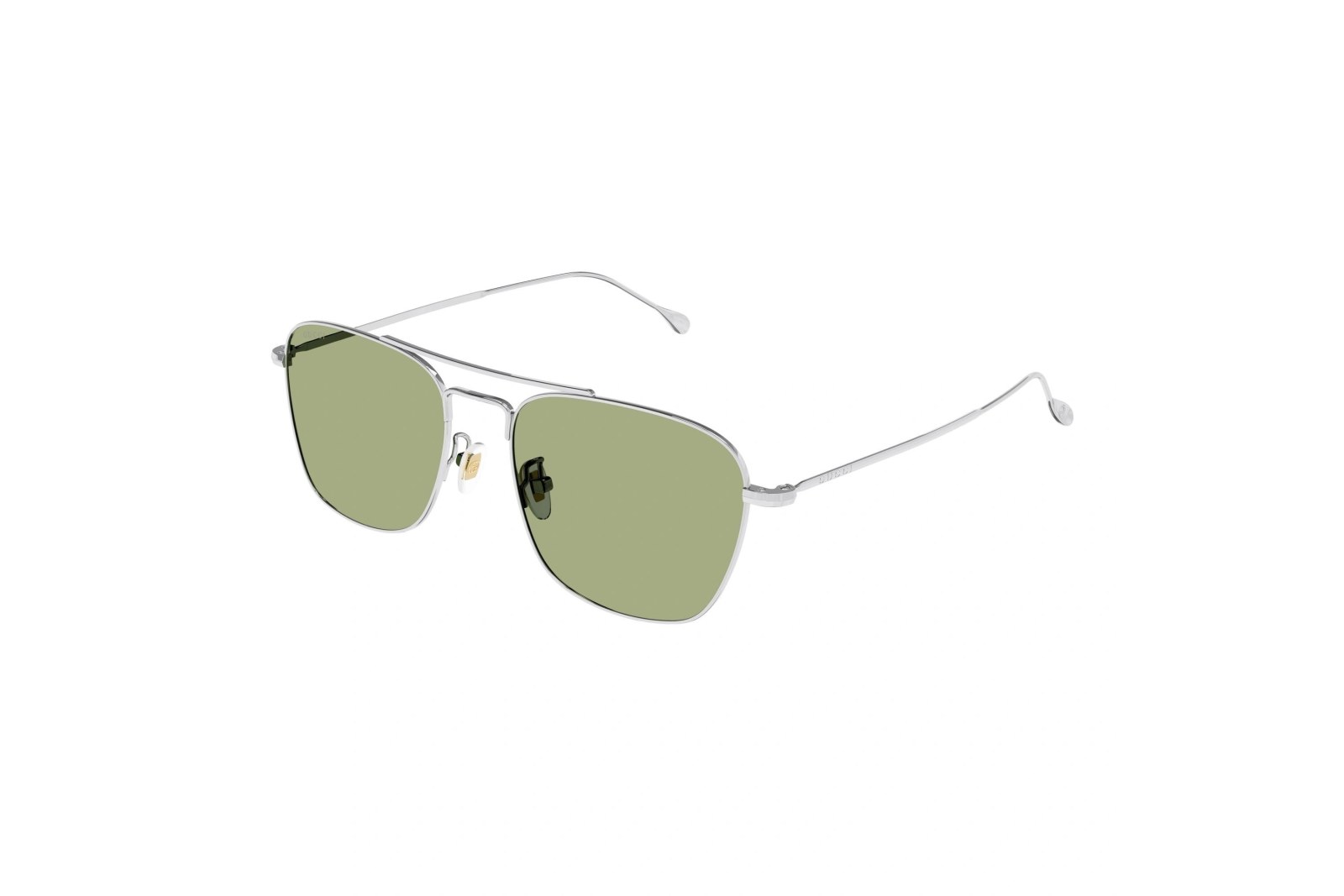 Классическая квадратная оправа выполнена из легкого серого металла и дополнена двойным мостиком. Зеленые линзы на 100% защищают глаза от вредного ультрафиолета. В комплекте — фирменный чехол и салфетка.