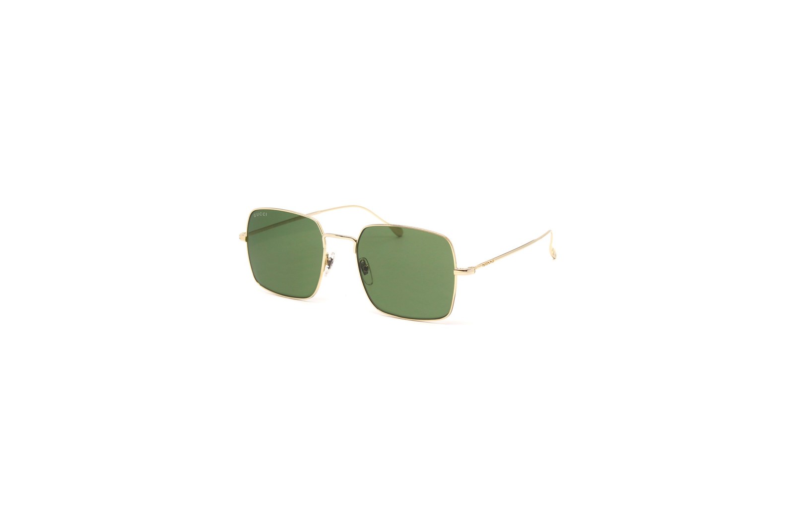 Объемная квадратная оправа выполнена из легкого золотого металла и дополнена тонкими заушниками. Зеленые линзы на 100% защищают глаза от вредного ультрафиолета. В комплекте — фирменный чехол и салфетка.