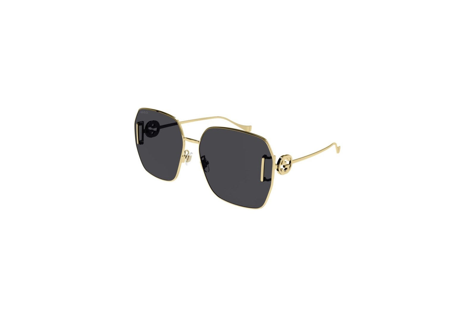 Объемная геометрическая оправа выполнена из легкого золотого металла, а дужки украшены логотипом бренда. Серые линзы на 100% защищают глаза от вредного ультрафиолета. В комплекте — фирменный футляр для очков и салфетка.