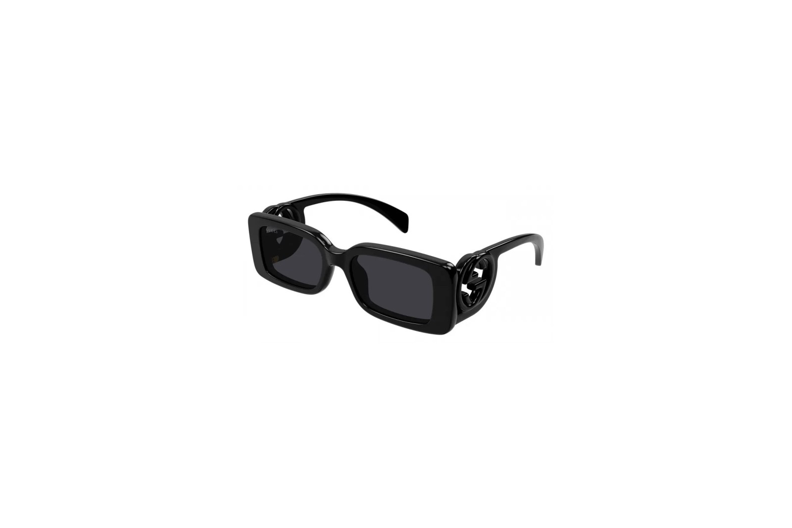 Стильная прямоугольная оправа выполнена из черного ацетата, а массивные дужки украшены логотипом бренда. Серые линзы на 100% защищают глаза от вредного ультрафиолета. В комплекте — фирменный чехол и салфетка.
