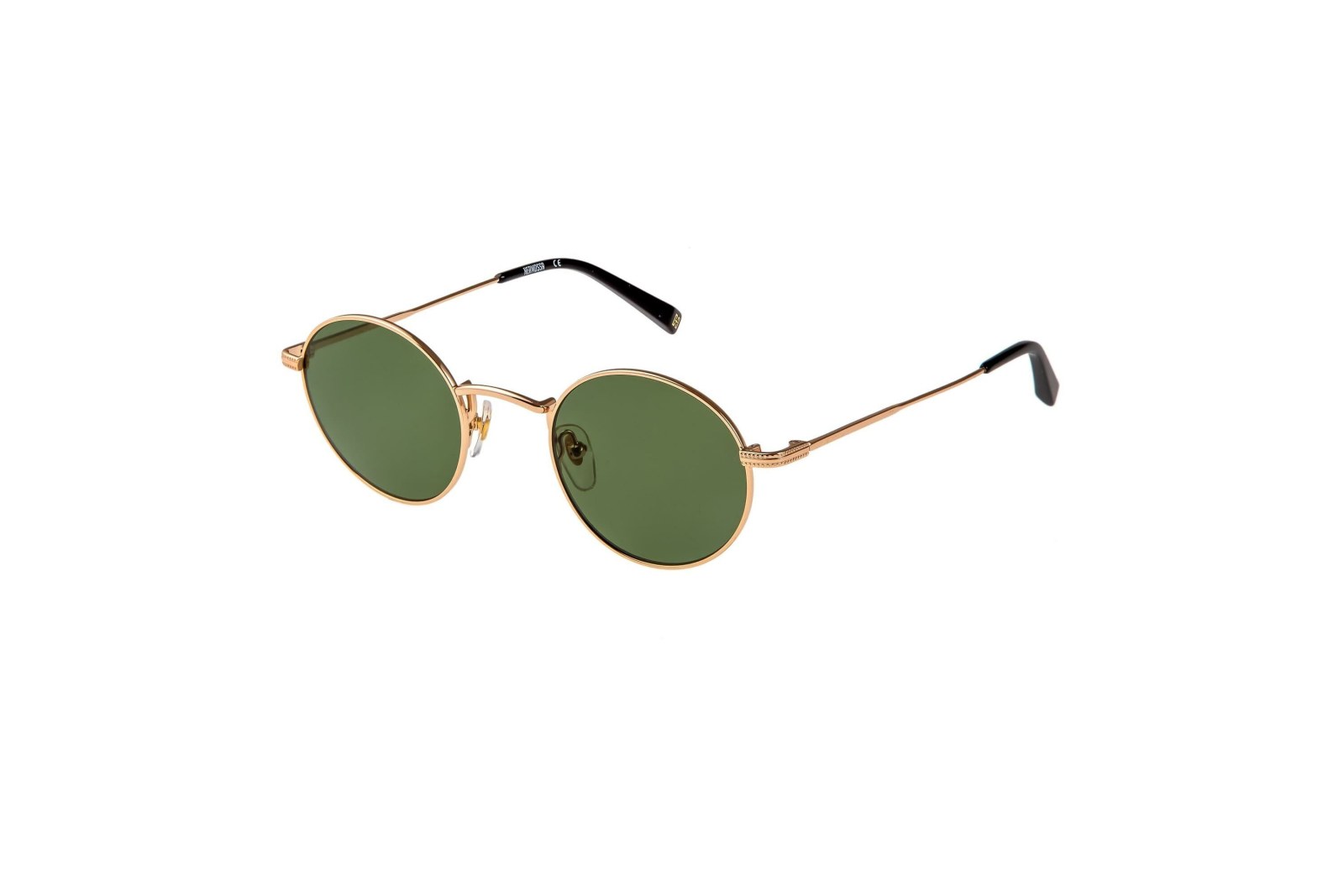 Изящная модель с круглой оправой выполнена из легкого золотого металла. Зеленые линзы на 100% защищают глаза от вредного ультрафиолета. В комплекте — фирменный чехол и салфетка.