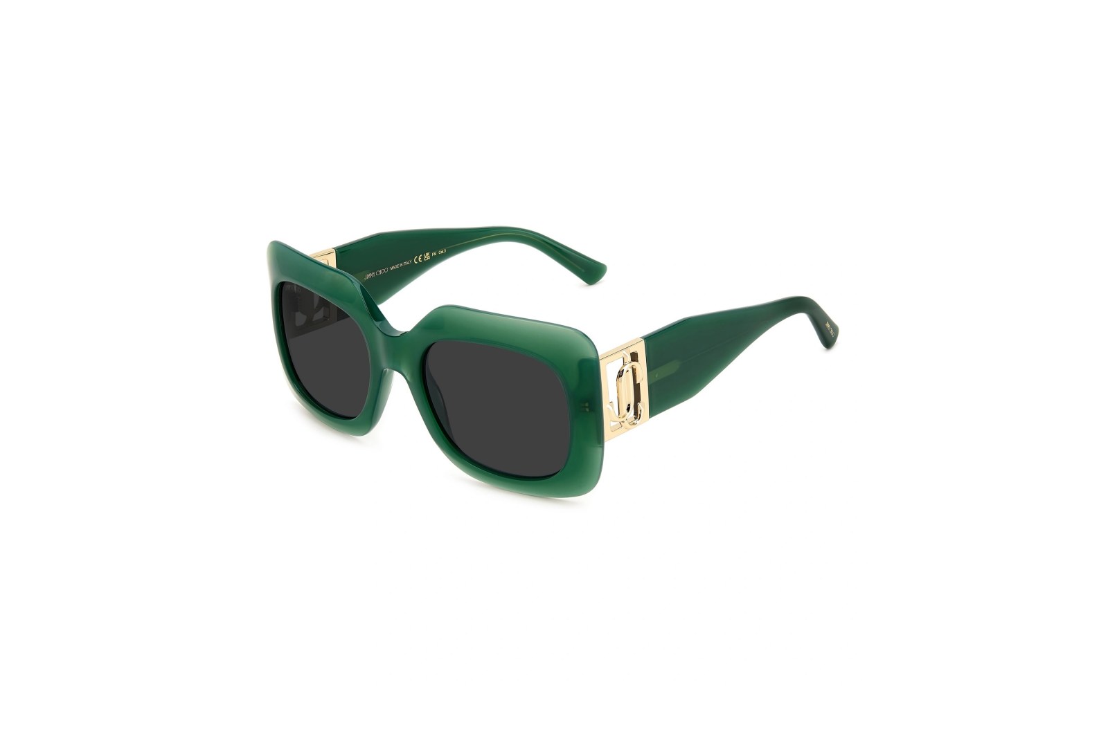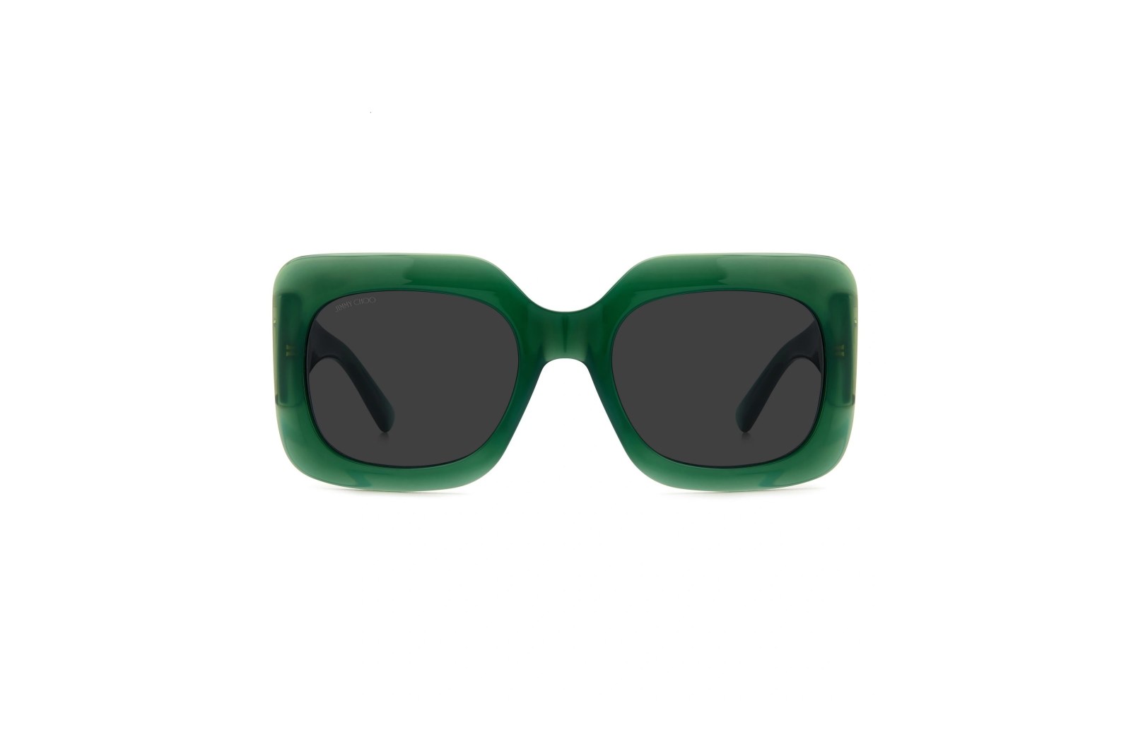 Массивная квадратная оправа из прочного зелёного ацетата. Поликарбонатные серые линзы на 100% защищают глаза от вредного ультрафиолета. Заушники украшены золотистой вставкой с логотипом бренда. В комплекте — фирменный чехол и салфетка.