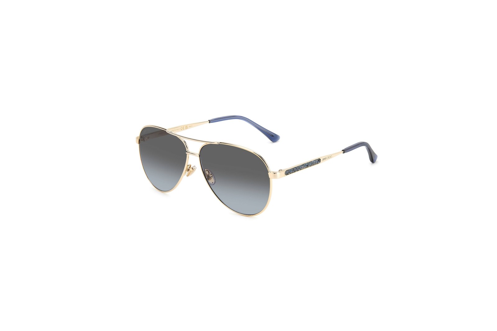 Стильная оправа-авиаторы выполнена из легкого золотого металла и дополнена серыми линзами. Тонкие дужки с синими заушниками украшены стразами и логотипом бренда. В комплекте — фирменный чехол и салфетка.
