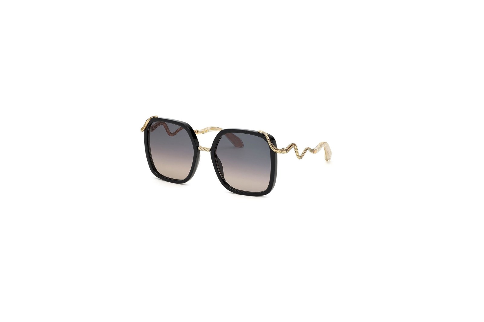 Стильная модель с квадратной оправой выполнена из легкого черного ацетата и дополнена оригинальными дужками в виде змей, выполненным из золотистого металла. Градиентные синие линзы на 100% защищают от вредного воздействия ультрафиолетовых лучей. В комплекте — фирменный чехол и салфетка.