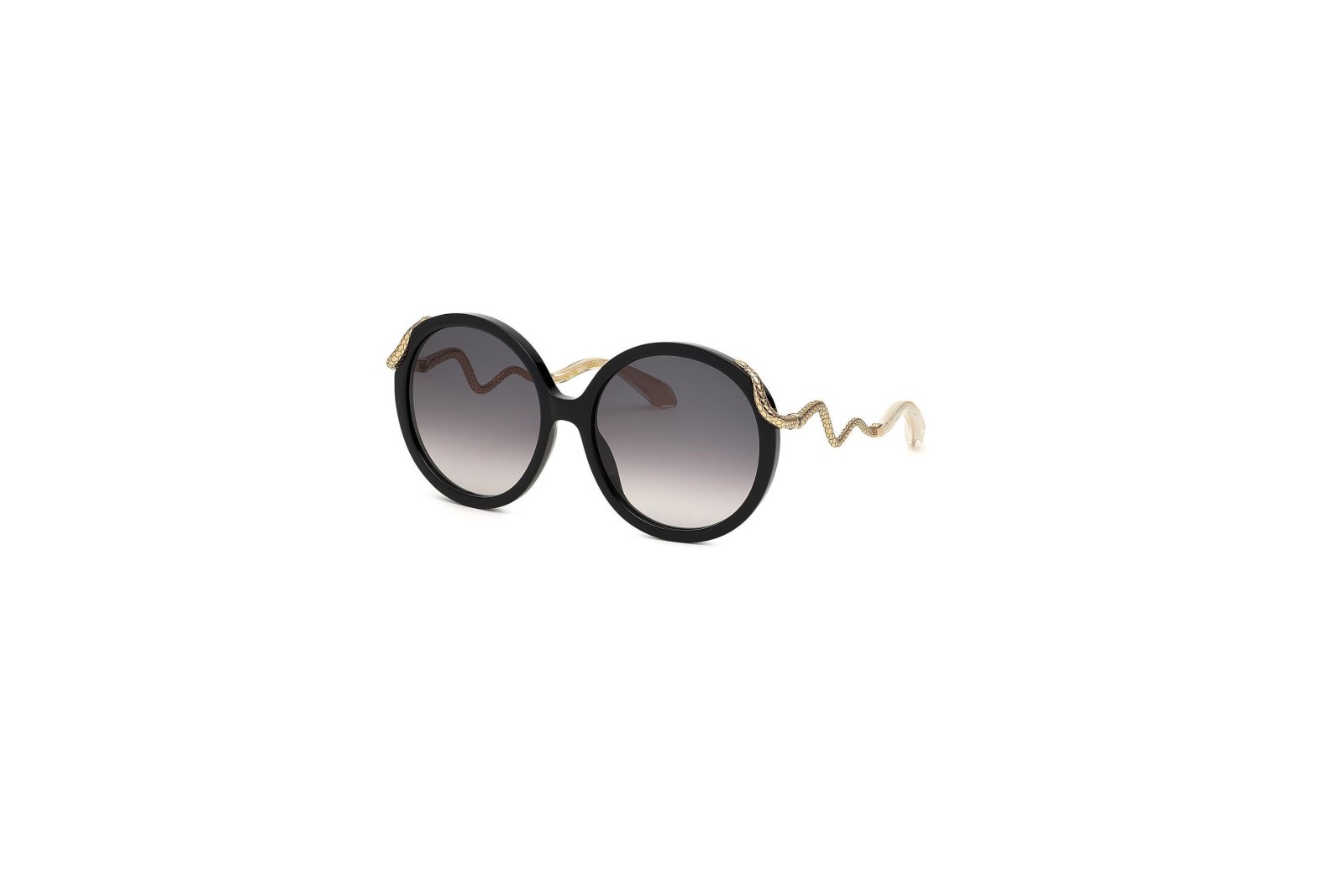 Стильная модель с круглой оправой выполнена из легкого черного ацетата и дополнена оригинальными дужками в виде змей, выполненным из золотистого металла. Градиентные синие линзы на 100% защищают от вредного воздействия ультрафиолетовых лучей. В комплекте — фирменный чехол и салфетка.