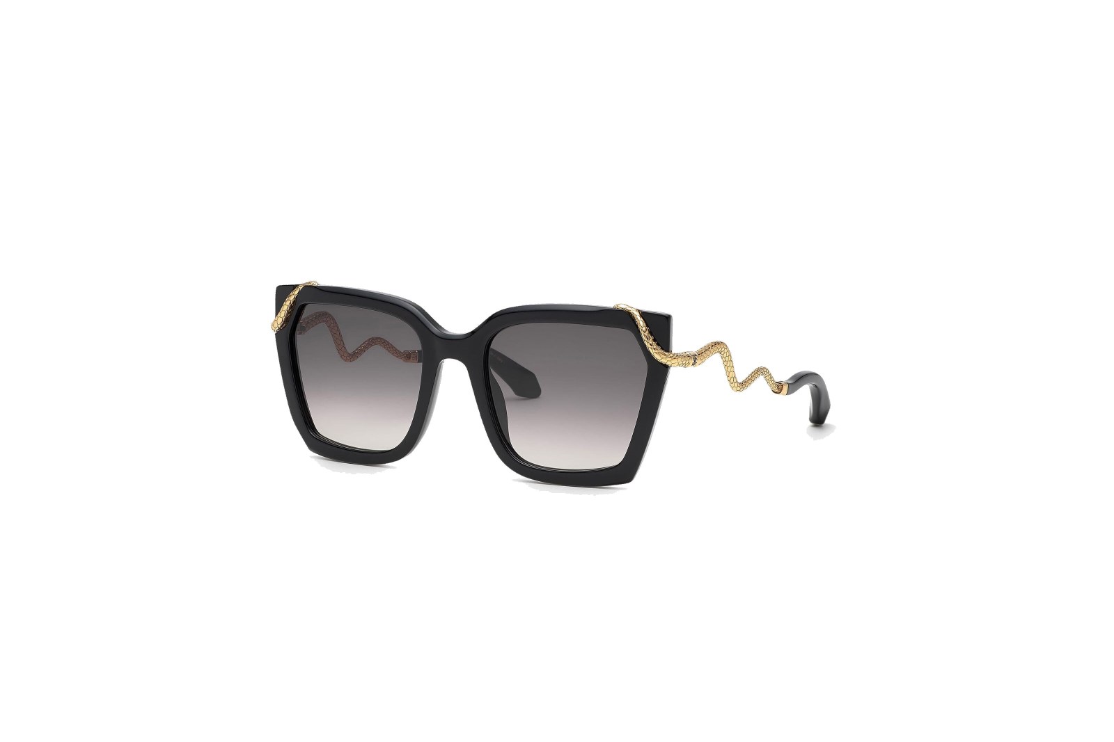 Стильная модель с оправой cat eye выполнена из легкого черного ацетата и дополнена оригинальными дужками в виде змей, выполненными из золотистого металла. Градиентные серые линзы на 100% защищают от вредного воздействия ультрафиолетовых лучей. В комплекте — фирменный чехол и салфетка.