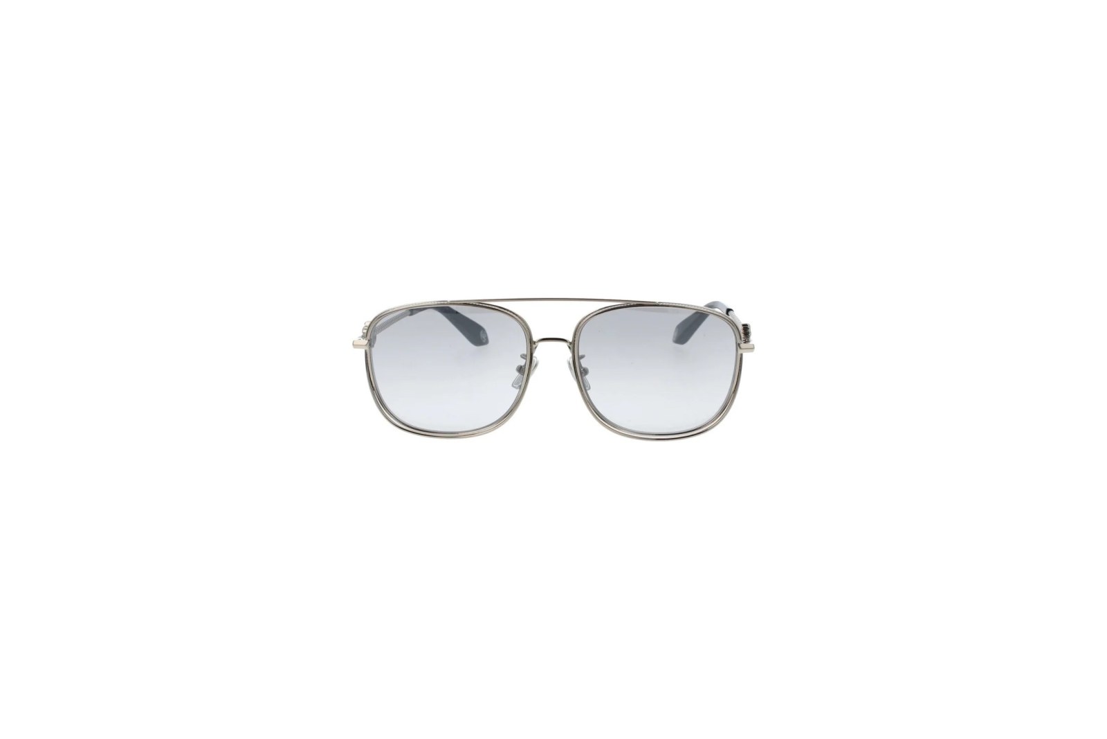 Оправа-авиаторы выполнена из легкого серебристого металла и дополнена тонкими заушниками. Голубые линзы на 100% защищают глаза от вредного ультрафиолета. В комплекте — фирменный чехол и салфетка.