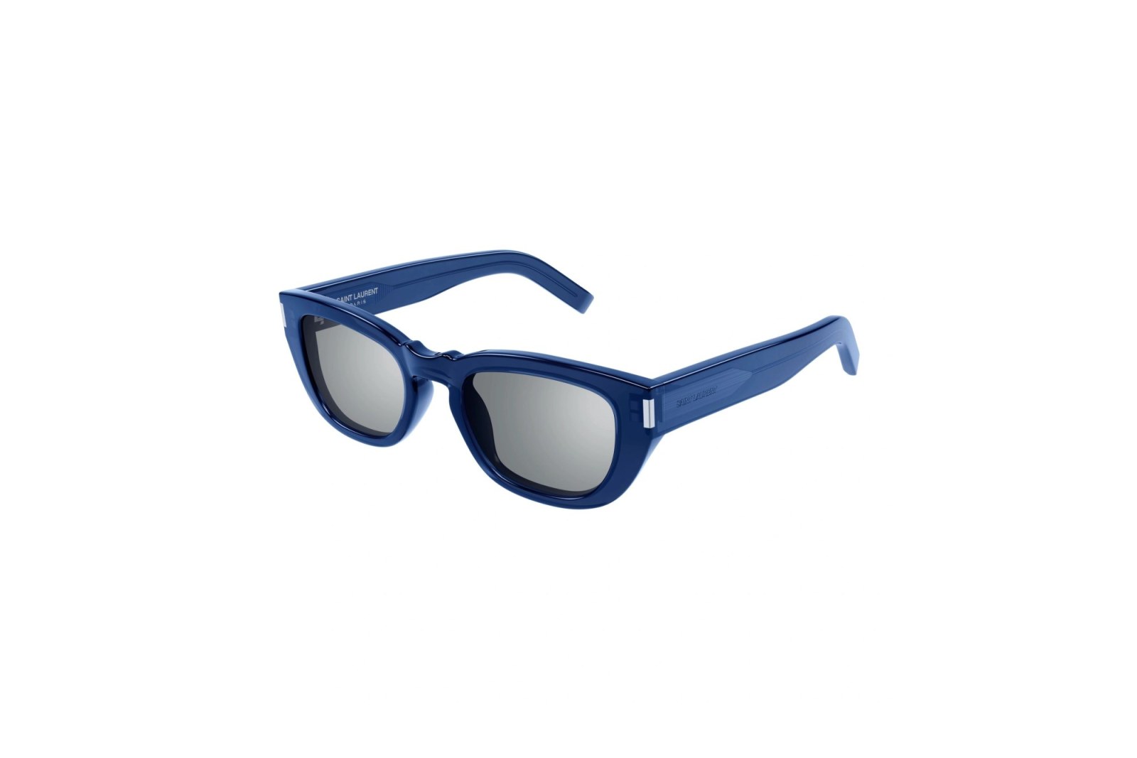 Стильная квадратная оправа из прочного ацетата синего цвета. Серые линзы на 100% защищают глаза от вредного ультрафиолета. Заушники украшены логотипом бренда. В комплекте — фирменный чехол и салфетка.